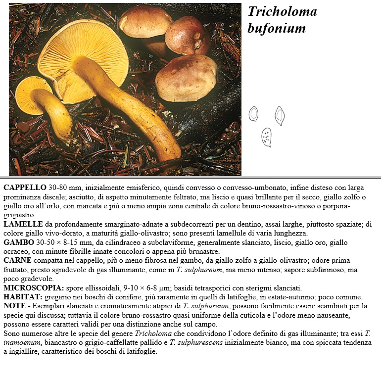CAPPELLO 30-80 mm, inizialmente emisferico, quindi convesso o convesso-umbonato, infine disteso con larga prominenza discale; asciutto, di aspetto minutamente feltrato, ma liscio e quasi brillante per il secco, giallo zolfo o giallo oro all'orlo, con marcata e più o meno ampia zona centrale di colore bruno-rossastro-vinoso o porpora-grigiastro. LAMELLE da profondamente smarginato-adnate a subdecorrenti per un dentino, assai larghe, piuttosto spaziate; di colore giallo cico-dorato, a maturità giallo-olivastro: sono presenti lamellule di varia lunghezza. GAMBO 30-50 x 8-15 mm; da cilindraceo a subclaviforme, generalmente slanciato, liscio, giallo oro; giallo ocraceo, con minute fibrille innate concolori o appena più brunastre. CARNE compatta nel cappello, più o meno fibrosa nel gambo, da giallo zolfo a giallo-olivastro; odore prima fruttato, presto sgradevole di gas illuminante, come in T. sulphureum; ma meno intenso; sapore subfarinoso, ma poco gradevole. MICROSCOPIA spore ellissoidali, 9-10 x 6-8 µm; basidi tetrasporici con sterigmi slanciati. HABITAT gregario nei boschi di conifere, più raramente in quelli di latifoglie; in estate-autunno; poco comune. NOTE - Esemplari slanciati e cromaticamente atipici di T. sulphureum, possono facilmente essere scambiati per la specie qui discussa; tuttavia il colore bruno-rossastro quasi uniforme della cuticola e l'odore meno nauseante, possono essere caratteri validi per una distinzione anche sul campo. Sono numerose altre le specie del genere Tricholoma che condividono l'odore definito di gas illuminante; tra essi T. inamoenum biancastro o grigio-caffellatte pallido e T. sulphurescens inizialmente bianco, ma con spiccata tendenza a ingiallire, caratteristico dei boschi di latifoglie.
