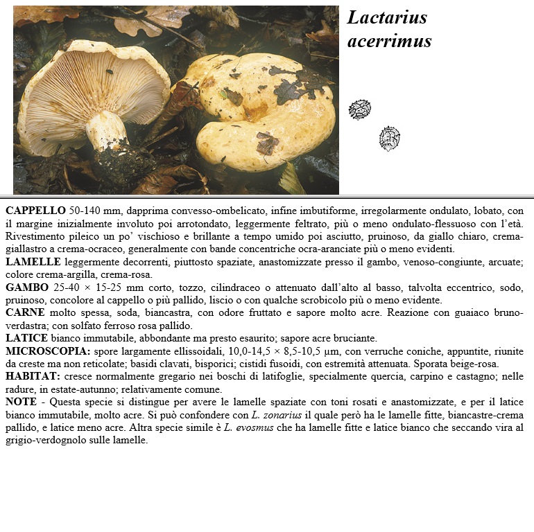 CAPPELLO 50-140 mm, dapprima convesso-ombelicato, infine imbutiforme, irregolarmente ondulato, lobato, con il margine inizialmente involuto poi arrotondato, leggermente feltrato, più o meno ondulato-flessuoso con l'età. Rivestimento pileico un po' vischioso e brillante a tempo umido poi asciutto, pruinoso, da giallo chiaro, crema-giallastro a crema-ocraceo, generalmente con bande concentriche ocra-aranciate più o meno evidenti. LAMELLE leggermente decorrenti, piuttosto spaziate, anastomizzate presso il gambo, venoso-congiunte, arcuate, colore crema-argilla, crema-rosa. GAMBO 25-40 x 15-25 mm corto, tozzo, cilindraceo o attenuato dall'alto al basso, talvolta eccentrico, sodo, pruinoso, concolore al cappello o più pallido, liscio o con qualche scrobicolo più o meno evidente. CARNE molto spessa, soda, biancastra, con odore fruttato e sapore molto acre. Reazione con guaiaco bruno-verdastra, con solfato ferroso rosa pallido. LATTICE bianco immutabile, abbondante ma presto esaurito, sapore acre bruciante. MICROSCOPIA spore largamente ellissoidali, 10,0-14,5 x 8,5-10,5 um, con verruche coniche, appuntite, riunite da creste ma non reticolate, basidi slavati, bisporici, cistidi fusoidi, con estremità attenuata. Sporata beige-rosa. HABITAT cresce normalmente gregario nei boschi di latifoglie, specialmente quercia, tarpino e castagno, nelle radure. in estate-autunno, relativamente comune. NOTE - Questa specie si distingue per avere le lamelle spaziate con toni rosati e anastomizzate, e per il lattice bianco immutabile, molto acre. Si può confondere con L. zonarius il quale però ha le lamelle fitte, biancastre-crema pallido, e lattice meno acre. Altra specie simile è L. evosmus che ha lamelle fitte e lattice bianco che seccando vira al grigio-verdognolo sulle lamelle.