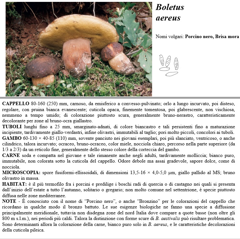 CAPPELLO 80-160 (250) mm, carnoso, da emisferico a convesso-pulvinato, orlo a lungo incurvato, poi disteso, regolare, con pruina bianca evanescente, cuticola opaca finemente tomentosa poi alabrescente, non vischiosa, nemmeno a tempo umido, di colorazione piuttosto scura, generalmente bruno-nerastro, caratteristicamente decolorante per zone al bruno-ocra giallastro. TUBOLI lunghi fino a 25 mm, smarginato-adnati, di colore biancastro e tali persistenti fino a maturazione incipiente, tardivamente giallo-verdastri, infine olivastri, immutabili al taglio, pori molto piccoli, concolori ai tuboli. GAMBO 60-130 x 40-85 (110) mm, sovente panciuto nei giovani esemplari, poi più slanciato, ventricoso, o anche cilindrico, talora incurvato, ocraceo, bruno-ocraceo, color miele, nocciola chiaro, percorso nella parte superiore (da 1/3 a 2/3) da un reticolo fine, generalmente dello stesso colore della corteccia del gambo. CARNE soda e compatta nel giovane e tale rimanente anche negli adulti, tardivamente molliccia, bianco puro, immutabile, non colorata sotto la cuticola del cappello. Odore debole ma assai gradevole, sapore dolce, come di nocciola. MICROSCOPIA spore fusiformi-ellissoidali, di dimensioni 13,5-16 x 4,0-5,0 µm, giallo pallido al MS, bruno olivastro in massa. HABITAT è il più termofilo fra i porcini e predilige i boschi radi di quercia o di castagno nei quali si presenta dall'inizio dell'estate a tutto l'autunno, solitario o gregario, non molto comune nel settentrione, è specie piuttosto diffusa nelle zone mediterranee. NOTE - E conosciuto con il nome di '`Porcino nero", o anche "Bronzino" per le colorazioni del cappello che ricordano in qualche modo il bronzo battuto. Le sue esigenze biologiche ne fanno una specie a diffusione principalmente meridionale, tuttavia non disdegna zone del nord Italia dove compare a quote basse (non oltre gli 800 m s.l.m.), nei periodi più caldi. Talora la distinzione con forme scure di B. aestivalis può risultare problematica. Sono determinanti allora la colorazione della carne, bianco puro solo in B. aereus, e le caratteristiche decolorazioni della cuticola pileica.