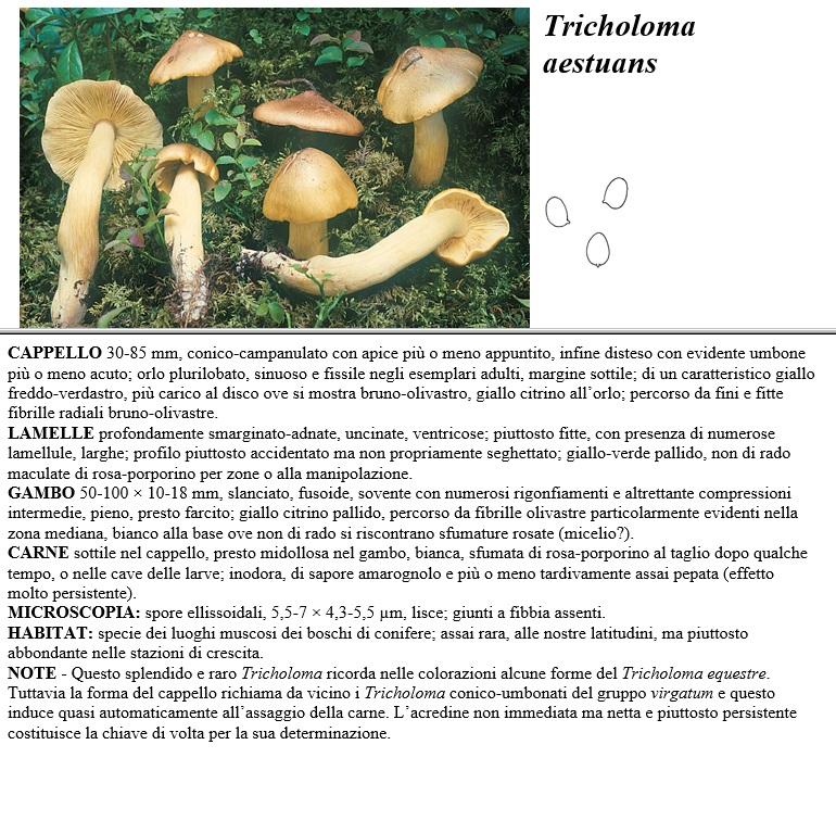 CAPPELLO 30-85 mm, conico-campanulato con apice più o meno appuntito: infine disteso con evidente umbone più o meno acuto; orlo plurilobato, sinuoso e fissile negli esemplari adulti, margine sottile: di un caratteristico giallo freddo-verdastro, più carico al disco ove si mostra bruno-olivastro, giallo citrino all'orlo; percorso da fini e fitte fibrille radiali bruno-olivastre. LAMELLE profondamente smarginato-adnate; uncinate, ventricose; piuttosto fitte, con presenza di numerose lamellule; larghe; profilo piuttosto accidentato ma non propriamente seghettato; giallo-verde pallido, non di rado maculate di rosa-porporino per zone o alla manipolazione. GAMBO 50-100 x 10-18 mm, slanciato, fusoide, sovente con numerosi rigonfiamenti e altrettante compressioni intermedie, pieno, presto farcito; giallo citrino pallido, percorso da fibrille olivastre particolarmente evidenti nella zona mediana, bianco alla base ove non di rado si riscontrano sfumature rosate (micelio). CARNE sottile nel cappello, presto midollosa nel gambo, bianca, sfumata di rosa-porporino al taglio dopo qualche tempo; o nelle cave delle larve; inodora, di sapore amarognolo e più o meno tardivamente assai pepata (effetto molto persistente). MICROSCOPIA spore ellissoidali, 5,5-7 x 4,3-5,5 µm; lisce; giunti a fibbia assenti. HABITAT specie dei luoghi muscosi dei boschi di conifere; assai rara, alle nostre latitudini, ma piuttosto abbondante nelle stazioni di crescita. NOTE - Questo splendido e raro Tricholoma ricorda nelle colorazioni alcune forme del Tricholoma equestre. Tuttavia la forma del cappello richiama da vicino i Tricholoma conico-umbonati del gruppo i irgatum e questo induce quasi automaticamente all'assaggio della carne. L'acredine non immediata ma netta e piuttosto persistente costituisce la chiave di volta per la sua determinazione.