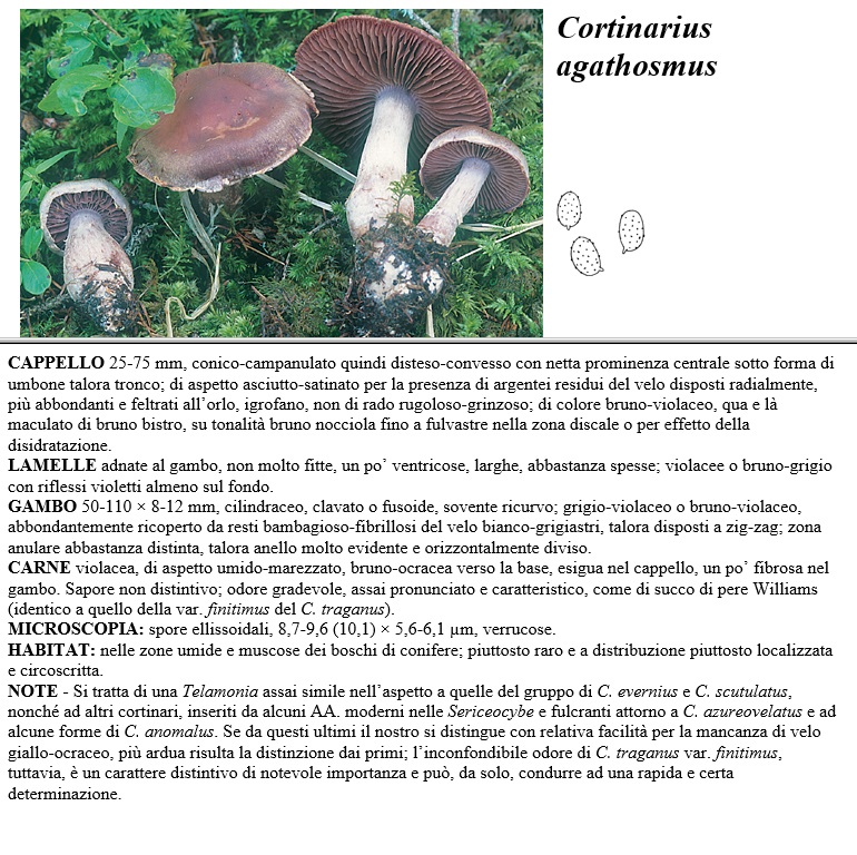 CAPPELLO 25-75 mm, conico-campanulato quindi disteso-convesso con netta prominenza centrale sotto forma di ambone talora tronco, di aspetto asciutto-satinato per la presenza di argentei residui del velo disposti radialmente, più abbondanti e feltrati all'orlo, igrofano, non di rado rugoloso-grinzoso, di colore bruno-violaceo, qua e là maculato di bruno bistro, su tonalità bruno nocciola fino a fulvastre nella zona distale o per effetto della disidratazione. LAMELLE adnate al gambo, non molto fitte; un po' ventricose, larshe, abbastanza spesse, violacee o bruno-grigio con riflessi violetti almeno sul fondo. GAMBO 50-110 x 8-12 mm, cilindraceo, clavato o fusoide, sovente ricurvo, grigio-violaceo o bruno-violaceo, abbondantemente ricoperto da resti bambagioso-fibrillosi del velo bianco-grigiastri, talora disposti a zig-zag: zona anulare abbastanza distinta, talora anello molto evidente e orizzontalmente diviso. CARNE violacea, di aspetto umido-marezzato, bruno-ocracea verso la base, esigua nel cappello, un po' fibrosa nel gambo. Sapore non distintivo, odore gradevole, assai pronunciato e caratteristico, come di succo di pere Williams (identico a quello della var. finitimus del C. traganus). MICROSCOPIA spore ellissoidali, 8,7-9,6 (10,1) x 5,6-6,1 µm, verrucose. HABITAT nelle zone umide e muscose dei boschi di conifere, piuttosto raro e a distribuzione piuttosto localizzata e circoscritta. NOTE - Si tratta di una Telamonia assai simile nell'aspetto a quelle del gruppo di C. evernius e C. scutulatus, nonché ad altri cortinari, inseriti da alcuni AA. moderni nelle Sericeocybe e fulcranti attorno a C azureovelatus e ad alcune forme di C. anomalus. Se da questi ultimi il nostro si distingue con relativa facilità per la mancanza di velo giallo-ocraceo, più ardua risulta la distinzione dai primi, l'inconfondibile odore di C. traganus car. finitimus, tuttavia, è un carattere distintivo di notevole importanza e può, da solo, condurre ad una rapida e certa determinazione.