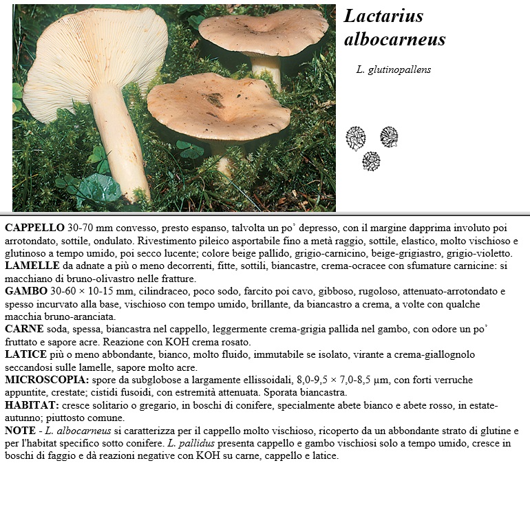 CAPPELLO 30-70 mm comvesso, presto espanso, talvolta un po' depresso, con il margine dapprima involuto poi arrotondato, sottile, ondulato. Rivestimento pileico asportabile fino a metà raggio, sottile, elastico, molto vischioso e glutinoso a tempo umido, poi secco lucente, colore beige pallido, grigio-carnicino, beige-grigiastro, grigio-violetto. LAMELLE da adnate a più o meno decorrenti, fitte, sottili, biancastre, crema-ocracee con sfumature camicine, si macchiano di bruno-olivastro nelle fratture. GAMBO 30-60 x 10-15 mm, cilindraceo, poco sodo, farcito poi cavo, gibboso, rugoloso, attenuato-arrotondato e spesso incurvato alla base, vischioso con tempo umido, brillante, da biancastro a crema, a volte con qualche macchia bruno-aranciata. CARNE soda, spessa, biancastra nel cappello, leggermente crema-grigia pallida nel gambo, con odore un po' fruttato e sapore acre. Reazione con KOH crema rosato. LATTICE più o meno abbondante, bianco, molto fluido, immutabile se isolato, virante a crema-giallognolo seccandosi sulle lamelle, sapore molto acre. MICROSCOPIA spore da subglobose a largamente ellissoidali, 8,0-9,5 x 7,0-8,5 µm, con forti verruche appuntite, crestate, cistidi fusoidi, con estremità attenuata. Sporata biancastra. HABITAT cresce solitario o gregario, in boschi di conifere, specialmente abete bianco e abete rosso, in estate-autunno, piuttosto comune. NOTE - L. albocarneus si caratterizza per il cappello molto vischioso, ricoperto da un abbondante strato di glutine e per l'habitat specifico sotto conifere. L. pallidus presenta cappello e gambo vischiosi solo a tempo umido, cresce in boschi di faggio e dà reazioni negative con KOH su came, cappello e latice.
