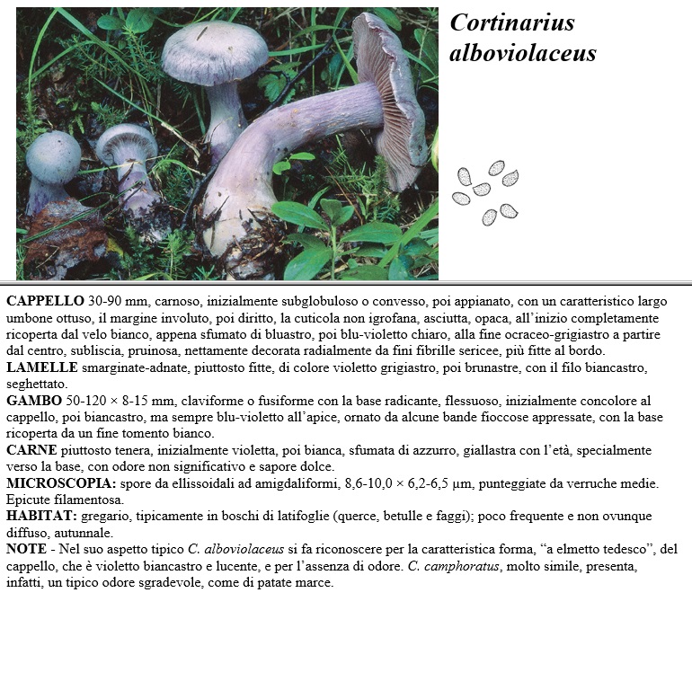 CAPPELLO 30-90 mm, carnoso, inizialmente subglobuloso o convesso, poi appianato, con un caratteristico largo umbone ottuso, il margine involuto, poi diritto, la cuticola non igrofana, asciutta, opaca, all'inizio completamente ricoperta dal velo bianco, appena sfumato di bluastro, poi blu-violetto chiaro, alla fine ocraceo-grigiastro a partire dal centro, subliscia pruinosa, nettamente decorata radialmente da fini fibrille sericee, più fitte al bordo. LAMELLE smarginate-adnate, piuttosto fitte, di colore violetto grigiastro, poi brunastre, con il filo biancastro, seghettato. GAMBO 50-120 x 8-15 mm, claviforme o fusiforme con la base radicante, flessuoso, inizialmente concolore al cappello, poi biancastro, ma sempre blu-violetto all'apice, ornato da alcune bande fioccose appressate, con la base ricoperta da un fine tomento bianco. CARNE piuttosto tenera; inizialmente violetta, poi bianca, sfumata di azzurro; giallastra con Petà specialmente verso la base, con odore non significativo e sapore dolce. MICROSCOPIA spore da ellissoidali ad amigdaliformi, 8,6-10,0 x 6,2-6,5 µm, punteggiate da verruche medie. Epicute filamentosa. HABITAT gregario, tipicamente in boschi di latifoglie (querce, betulle e faggi), poco frequente e non ovunque diffuso, autunnale. NOTE -Nel suo aspetto tipico C. alboviolaceus si fa riconoscere per la caratteristica forma; "a elmetto tedesco", del cappello, che è violetto biancastro e lucente, e per l'assenza di odore. C. camphoratus, molto simile, presenta, infatti, un tipico odore sgradevole, come di patate marce.