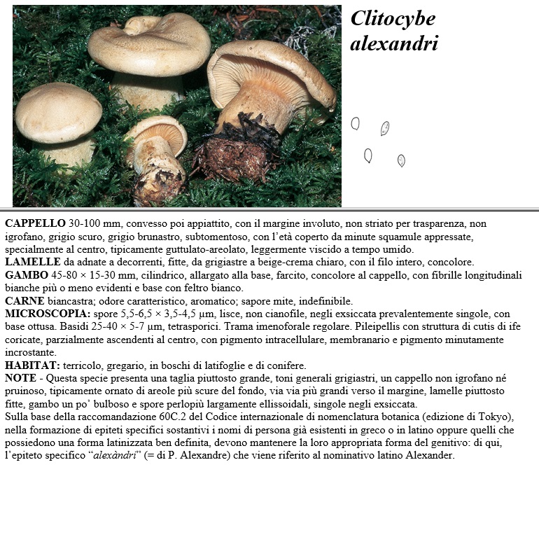 CAPPELLO 30-100 mm, convesso poi appiattito, con il margine involuto, non striato per trasparenza, non igrofano, grigio scuro, grigio brunastro, subtomentoso, con 1'età coperto da minute squamule appressate, specialmente al centro, tipicamente guttulato-areolato, leggermente viscido a tempo umido. LAMELLE da adnate a decorrenti, fitte, da grigiastre a beige-crema chiaro, con il filo intero, concolore. GAMBO 45-80 x 15-30 mm, cilindrico, allargato alla base, farcito, concolore al cappello, con fibrille longitudinali bianche più o meno evidenti e base con feltro bianco. CARNE biancastra; odore caratteristico, aromatico; sapore mite, indefinibile. MICROSCOPIA spore 5,5-6,5 x 3,5-4,5 µm, lisce, non cianofile, negli exsiccata prevalentemente singole, con base ottusa. Basidi 25-40 x 5-7 µm, tetrasporici. Trama imenoforale regolare. Pileipellis con struttura di cutis di ife coricate, parzialmente ascendenti al centro, con pigmento intracellulare, membranario e pigmento minutamente incrostante. HABITAT terricolo, gregario, in boschi di latifoglie e di conifere. NOTE - Questa specie presenta una taglia piuttosto grande, toni generali grigiastri, un cappello non igrofano né pruinoso, tipicamente ornato di areole più scure del fondo, via via più grandi verso il margine, lamelle piuttosto fitte, gambo un po' bulboso e spore perlopiù largamente ellissoidalì, singole negli exsiccata. Sulla base della raccomandazione 60C2 del Codice Internazionale di nomenclatura botanica (edizione di Tokyo), nella formazione di epiteti specifici sostantivi i nomi di persona già esistenti in greco o in latino oppure quelli che possiedono una forma latinizzata ben defmita, devono mantenere la loro appropriata forma del genitivo, di qui, l'epiteto specifico "alexàndri" (di P. Alexandre) che viene riferito al nominativo latino Alexander