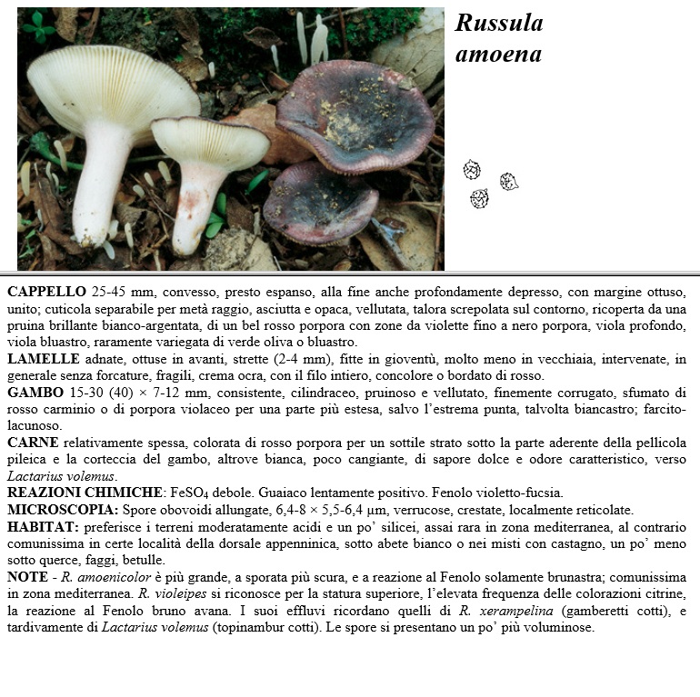 CAPPELLO 25-45 mm, convesso, presto espanso; alla fine anche profondamente depresso, con margine ottuso; unito; cuticola separabile per metà raggio, asciutta e opaca, vellutata talora screpolata sul contorno, ricoperta da una pruina brillante bianco-argentata, di un bel rosso porpora con zone da violette fino a nero porpora; viola profondo; viola bluastro, raramente variegata di verde oliva o bluastro. LAMELLE adnate, ottuse in acanti; strette (2-4 mm), fitte in gioventù, molto meno in vecchiaia. intervenate, in generale senza forcature; fragili, crema ocra; con il filo intiero; concolore o bordato di rosso. GAMBO 15-30 (40) x 7-12 mm, consistente, cilindraceo; pruinoso e vellutato, finemente corrugato, sfumato di rosso carminio o di porpora violaceo per una parte più estesa; salvo l'estrema punta, talvolta biancastro; farcito-lacunoso. CARNE relativamente spessa, colorata di rosso porpora per un sottile strato sotto la parte aderente della pellicola pileica e la corteccia del gambo; altrove bianca; poco cangiante, di sapore dolce e odore caratteristico, verso Lactarius vo1emus. REAZIONI CHIMICHE FeSO4 debole. Guaiaco lentamente positivo. Fenolo violetto-fucsia. MICROSCOPIA Spore obovoidi allungate, 6,4-8 x 5,5-6,4 um, cerrucose; crestate; localmente reticolate. HABITAT preferisce i terreni moderatamente acidi e un po' silicei, assai rara in zona mediterranea, al contrario comunissima in certe località della dorsale appenninica sotto abete bianco o nei misti con castagno, un po' meno sotto querce, faggi; betulle. NOTE - R. amoenicolor è più grande, a sporata più scura, e a reazione al Fenolo solamente brunastra; comunissima in zona mediterranea. R. violeipes si riconosce per la statura superiore, l'elevata frequenza delle colorazioni citrine; la reazione al Fenolo bruno avana. I suoi effluvi ricordano quelli di R. xerampelina (gamberetti cotti), e tardivamente di Lactarius volemus (topinambur cotti). Le spore si presentano un po' più voluminose.