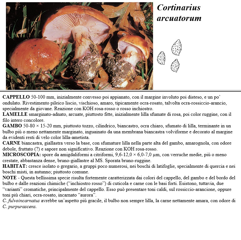 CAPPELLO 50-100 mm, inizialmente convesso poi appianato, con il margine involuto poi disteso, e un po' ondulato. Rivestimento pileico liscio, vischioso, amaro, tipicamente ocra-rosato, talvolta ocra-rossiccio-arancio, specialmente da giovane. Reazione con KOH rosa-rosso o rosso inchiostro. LAMELLE smarginato-adnato, arcuate, piuttosto fitte, inizialmente lilla sfumate di rosa, poi color ruggine, con il filo intero concolore. GAMBO 50-80 x 15-20 mm, piuttosto tozzo, cilindrico, biancastro, ocra chiaro, sfumato di lilla, terminante in un bulbo più o meno nettamente marginato, inguainato da una membrana biancastra volviforme e decorato al margine da evidenti resti di velo color lilla-ametista. CARNE biancastra, giallastra verso la base, con sfumature lilla nella parte alta del gambo, amarognola, con odore debole, fruttato e sapore non significativo. Reazione con KOH rosa-rosso. MICROSCOPIA spore da amigdaliformi a citriformi, 9,6-12,0 x 6,0-7,0 µm, con verruche medie, più o meno crestate, abbastanza dense, bruno-giallastre al MS. Sporata bruno-ruggine. HABITAT cresce isolato o gresario, a gruppi poco numerosi, nei boschi di latifoglie, specialmente di quercia e nei boschi misti, in autunno, piuttosto comune. NOTE - Questa bellissima specie risulta fortemente caratterizzata dai colori del cappello, del gambo e del bordo del bulbo e dalle reazioni chimiche ("inchiostro rosso") di cuticola e carne con le basi forti. Esistono, tuttavia, due "varianti' cromatiche, principalmente del cappello. Esso può presentare toni caldi, sul rossiccio-arancione, oppure toni più chiari, ocra-rosato, incarnato "aurora". C fulvoincarnatus avrebbe un'aspetto più gracile, il bulbo non sempre lilla, la carne nettamente amara, con odore di C. purpurascens