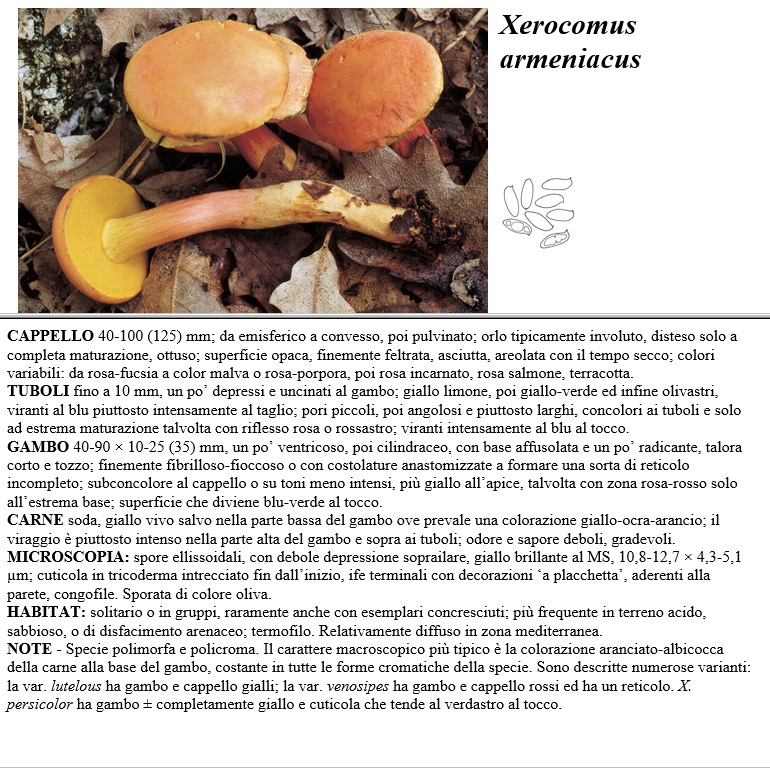 CAPPELLO 40-100 (125) mm, da emisferico a convesso, poi pulvinato, orlo tipicamente involuto, disteso solo a completa maturazione, ottuso, superficie opaca, finemente feltrata, asciutta, areolata con il tempo secco, colori variabili, da rosa-fucsia a color malva o rosa-porpora, poi rosa incarnato, rosa salmone, terracotta. TUBOLI fino a 10 mm, un po' depressi e uncinati al gambo, giallo limone, poi giallo-verde ed infine olivastri, viranti al blu piuttosto intensamente al taglio, pori piccoli, poi angolosi e piuttosto larghi, concolori ai tuboli e solo ad estrema maturazione talvolta con riflesso rosa o rossastro, viranti intensamente al blu al tocco. GAMBO 40-90 x 10-25 (35) mm, un po' ventricoso, poi cilindraceo, con base affusolata e un po' radicante, talora corto e tozzo, finemente fibrilloso-fioccoso o con costolature anastomizzate a formare una sorta di reticolo incompleto, subconcolore al cappello o su toni meno intensi, più giallo all'apice, talvolta con zona rosa-rosso solo all'estrema base, superficie che diviene blu-verde al tocco. CARNE soda, giallo vivo salvo nella parte bassa del gambo ove prevale una colorazione giallo-ocra-arancio, il viraggio è piuttosto intenso nella parte alta del gambo e sopra ai tuboli, odore e sapore deboli, gradevoli. MICROSCOPIA spore ellissoidali, con debole depressione soprailare, giallo brillante al MS, 10,8-12,7 x4,3-5,1 µm, cuticola in tricoderma intrecciato fin dall'inizio, ife terminali con decorazioni "a placchetta", aderenti alla parete, congofile. Sporata di colore oliva. HABITAT solitario o in gruppi, raramente anche con esemplari concresciuti, più frequente in terreno acido, sabbioso, o di disfacimento arenacea termofilo. Relativamente diffuso in zona mediterranea. NOTE - Specie polimorfa e policroma. Il carattere macroscopico più tipico è la colorazione aranciato-albicocca della carne alla base del gambo, costante in tutte le forme cromatiche della specie. Sono descritte numerose varianti: la var. lutelous ha gambo e cappello gialli; la var. venosipes ha gambo e cappello rossi ed ha un reticolo. X. persicolor ha gambo più o meno completamente giallo e cuticola che tende al verdastro al tocco.