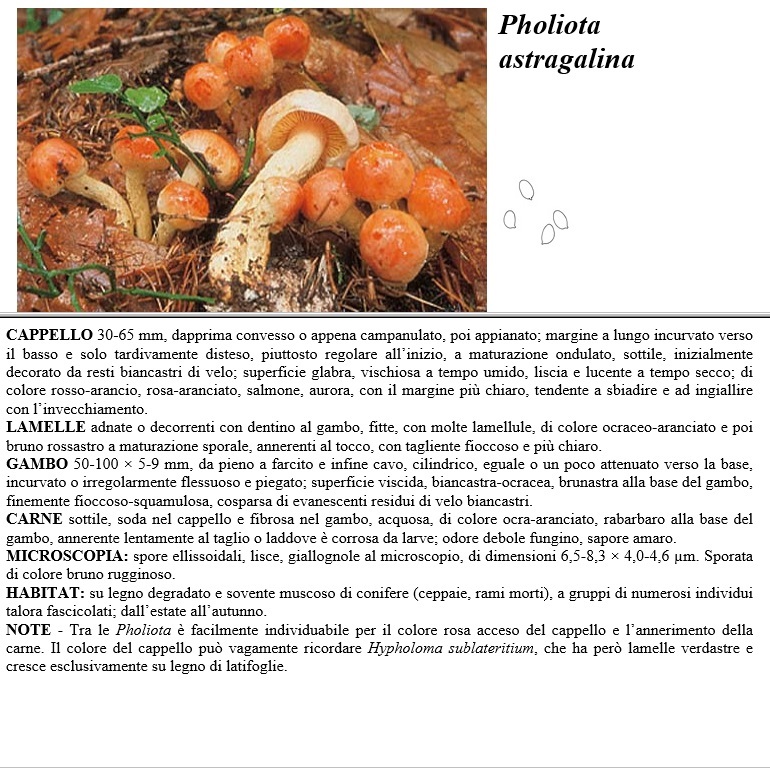 CAPPELLO 30-65 mm, dapprima convesso o appena campanulato, poi appianato, margine a lungo incurvato verso il basso e solo tardivamente disteso, piuttosto regolare all'inizio, a maturazione ondulato, sottile, inizialmente decorato da resti biancastri di celo, superficie glabra, vischiosa a tempo umido, liscia e lucente a tempo secco, di colore rosso-arancio, rosa-aranciato, salmone, aurora, con il margine più chiaro, tendente a sbiadire e ad ingiallire con l'incecchiamento. LAMELLE adnate o decorrenti con dentino al gambo, fitte, con molte lamellule, di colore ocraceo-aranciato e poi bruno rossastro a maturazione sporale, annerenti al tocco, con tagliente fioccoso e più chiaro. GAMBO 50-100 x 5-9 mm, da pieno a farcito e infine cavo, cilindrico, eguale o un poco attenuato verso la base, incurvato o irregolarmente flessuoso e piegato, superficie ciscida, biancastra-ocracea, brunastra alla base del gambo, finemente fioccoso-squamulosa, cosparsa di evanescenti residui di velo biancastri. CARNE sottile, soda nel cappello e fibrosa nel gambo, acquosa, di colore ocra-aranciato, rabarbaro alla base del gambo, annerente lentamente al taglio o laddove è corrosa da larve: odore debole fungino, sapore amaro. MICROSCOPIA spore ellissoidali, lisce, giallognole al microscopio, di dimensioni 6,5-8,3 x 4,0-4,6 µm. Sporata di colore bruno ruseinoso. HABITAT su legno degradato e sovente muscoso di conifere (ceppaie, rami morti), a gruppi di numerosi individui talora fascicolati, dall'estate all'autunno. NOTE - Tra le Pholiota è facilmente individuabile per il colore rosa acceso del cappello e l'annerimento della carne. Il colore del cappello può vagamente ricordare Hypholoma sublateritium, che ha però lamelle verdastre e cresce esclusivamente su legno di latifoglie.
