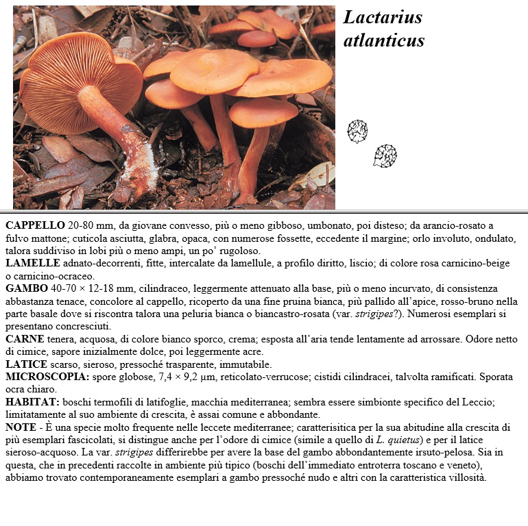 CAPPELLO 20-80 mm, da giovane convesso, più o meno gibboso, umbonato, poi disteso, da arancio-rosato a fulvo mattone, cuticola asciutta, glabra, opaca, con numerose fossette, eccedente il margine, orlo involuto, ondulato, talora suddiviso in lobi più o meno ampi, un po' rugoloso. LAMELLE adnato-decorrenti, fitte, intercalate da lamellule, a profilo diritto, liscio, di colore rosa carnicino-beige o carnicino-ocraceo. GAMBO 40-70 x 12-18 mm, cilindraceo, leggermente attenuato alla base, più o meno incurvato, di consistenza abbastanza tenace, concolore al cappello, ricoperto da una fine pruina bianca, più pallido all'apice, rosso-bruno nella parte basale dove si riscontra talora una peluria bianca o biancastro-rosata (var. strigipes). Numerosi esemplari si presentano concresciuti. CARNE tenera, acquosa, di colore bianco sporco, crema, esposta all'aria tende lentamente ad arrossare. Odore netto di cimice, sapore inizialmente dolce, poi leggermente acre. LATTICE scarso, sieroso, pressoché trasparente, immutabile. MICROSCOPIA spore globose, 7,4 x 9,2 µm, reticolato-verrucose, cistidi cilindracei, talvolta ramificati. Sporata ocra chiaro. HABITAT boschi termofili di latifoslie, macchia mediterranea, sembra essere simbionte specifico del Leccio, limitatamente al suo ambiente di crescita, è assai comune e abbondante. NOTE - E una specie molto frequente nelle leccete mediterranee, caratterisitica per la sua abitudine alla crescita di più esemplari fascicolati, si distingue anche per l'odore di cimice (simile a quello di L. quietus) e per il latice sieroso-acquoso. La var. strigipes differirebbe per avere la base del gambo abbondantemente irsuto-pelosa. Sia in questa, che in precedenti raccolte in ambiente più tipico (boschi dell'immediato entroterra toscano e veneto), abbiamo trovato contemporaneamente esemplari a gambo pressoché nudo e altri con la caratteristica villosità.