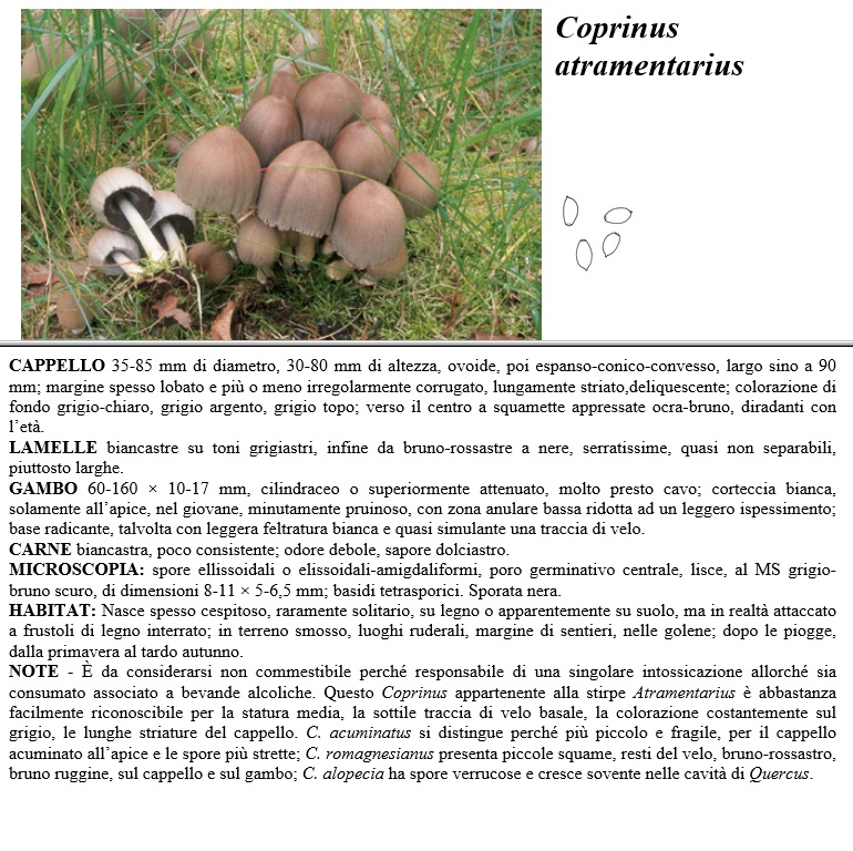 CAPPELLO 35-85 mm di diametro, 30-85 mm di altezza, ovoide, poi espanso-conico-concesso, largo sino a 90 mm, margine spesso lobato e più o meno irregolarmente corrugato, lungamente striato, deliquescente, colorazione di fondo grigio-chiaro, grigio argento, grigio topo, verso il centro a squamette appressate ocra-bruno, diradanti con l'età. LAMELLE biancastre su toni grigiastri, infine da bruno-rossastre a nere, serratissime, quasi non separabili, piuttosto larghe. GAMBO 60-160 x 10-17 mm, cilindraceo o superiormente attenuato, molto presto caco, corteccia bianca, solamente all'apice, nel giovane, minutamente pruinoso, con zona anulare bassa ridotta ad un leggero ispessimento, base radicante, talvolta con leggera feltratura bianca e quasi simulante una traccia di velo. CARNE biancastra, poco consistente, odore debole, sapore dolciastro. MICROSCOPIA spore ellissoidali o elissoidali-amigdaliformi, poro germinativo centrale, lisce, al MS grigio-bruno scuro, di dimensioni 8- 11 x 5-6,5 mm, basidi tetrasporici. Sporata nera. HABITAT Nasce spesso cespitoso, raramente solitario, su legno o apparentemente su suolo, ma in realtà attaccato a frustoli di legno interrato, in terreno smosso, luoghi ruderali, margine di sentieri, nelle golene, dopo le piogge, dalla primavera al tardo autunno. NOTE - È da considerarsi non commestibile perché responsabile di una singolare intossicazione allorché sia consumato associato a bevande alcoliche. Questo Coprinus appartenente alla stirpe Atramentarius è abbastanza facilmente riconoscibile per la statura media, la sottile traccia di velo basale, la colorazione costantemente sul grigio, le lunghe striature del cappello. C. acuminatus si distingue perché più piccolo e frasile, per il cappello acuminato all'apice e le spore più strette, C. romagnesianus presenta piccole squame, resti del velo, bruno-rossastro, bruno ruggine, sul cappello e sul gambo, C. alopecia ha spore verrucose e cresce sovente nelle cavità di Quercus.