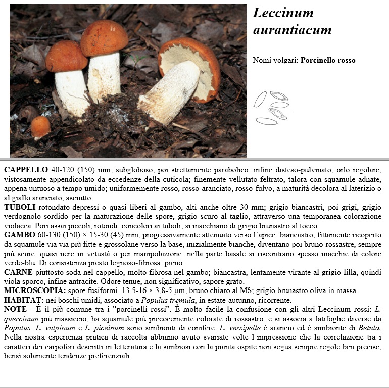 CAPPELLO 40-120 (150) mm, subgloboso, poi strettamente parabolico, infine disteso-pulvinato, orlo regolare, vistosamente appendicolato da eccedenze della cuticola, finemente vellutato-feltrato, talora con squamule adnate, appena untuoso a tempo umido, uniformemente rosso, rosso-aranciato, rosso-fulvo, a maturità decolora al laterizio o al giallo aranciato, asciutto. TUBOLI rotondato-depressi o quasi liberi al gambo, alti anche oltre 30 mm, grigio-biancastri, poi grigi, grigio verdognolo sordido per la maturazione delle spore, grigio scuro al taglio, attraverso una temporanea colorazione violacea. Pori assai piccoli, rotondi, concolori ai tuboli, si macchiano di grigio brunastro al tocco. GAMBO 60-130 (150) x 15-30 (45) mm, progressivamente attenuato verso l'apice, biancastro, fittamente ricoperto da squamule via via più fitte e grossolane verso la base, inizialmente bianche, diventano poi bruno-rossastre, sempre più scure, quasi nere in vetustà o per manipolazione, nella parte basale si riscontrano spesso macchie di colore verde-blu. Di consistenza presto legnoso-fibrosa, pieno. CARNE piuttosto soda nel cappello, molto fibrosa nel gambo, biancastra, lentamente virante al grigio-lilla, quindi viola sporco, infine antracite. Odore tenue, non significativo, sapore grato. MICROSCOPIA spore fusiformi, l3,5-16 x 3,3-5 µm, bruno chiaro al MS, grigio brunastro oliva in massa. HABITAT nei boschi umidi, associato a Populus tremula, in estate-autunno, ricorrente. NOTE - E il più comune tra i "porcinelli rossi". E molto facile la confusione con gli altri Leccinum rossi: L. quercinum più massiccio, ha squamule più precocemente colorate di rossastro, e si associa a latifoglie diverse da Populus; L. vulpinum e L. piceinum sono simbionti di conifere; L. versipelle è arancio ed è simbionte di Betula. Nella nostra esperienza pratica di raccolta abbiamo avuto svariate volte l'impressione che la correlazione tra i caratteri dei carpofori descritti in letteratura e la simbiosi con la pianta ospite non segua sempre regole ben precise, bensì solamente tendenze preferenziali.