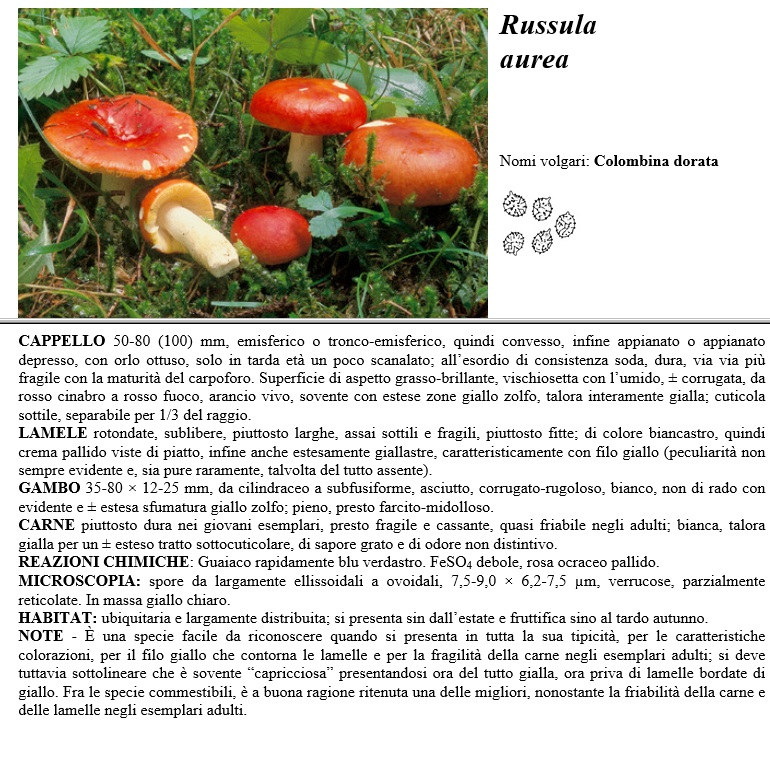 CAPPELLO 50-80 (100) mm; emisferico o tronco-emisferico; quindi convesso, infine appianato o appianato depresso, con orlo ottuso, solo in tarda età un poco scanalato; all'esordio di consistenza soda; dura, via via più fragile con la maturità del carpoforo. Superficie di aspetto grasso-brillante, vischiosetta con l'umido, più o meno corrugata; da rosso cinabro a rosso fuoco, arancio cico; sovente con estese zone giallo zolfo, talora interamente gialla; cuticola sottile, separabile per 13 del raggio. LAMELLE rotondate; sublibere, piuttosto larghe; assai sottili e fragili, piuttosto fitte; di colore biancastro; quindi crema pallido viste di piatto; infine anche estesamente giallastre, caratteristicamente con filo giallo (peculiarità non sempre evidente e, sia pure raramente; talvolta del tutto assente). GAMBO 35-80 x 12-25 mm, da cilindraceo a subfusiforme; asciutto, corrugato-rugoloso, bianco, non di rado con evidente e'- estesa sfumatura giallo zolfo; pieno; presto farcito-midolloso. CARNE piuttosto dura nei giovani esemplari; presto fragile e cassante, quasi friabile negli adulti; bianca, talora gialla per un t esteso tratto sottocuticolare, di sapore grato e di odore non distintivo. REAZIONI CHIMICHE Guaiaco rapidamente blu verdastro. FeSO4 debole, rosa ocraceo pallido. MICROSCOPIA: spore da largamente ellissoidali a ovoidali. 7,5-9,0 x 6,2-7,5 µm, cerrucose; parzialmente reticolate. In massa giallo chiaro. HABITAT ubiquitaria e largamente distribuita; si presenta sin dall'estate e fruttifica sino al tardo autunno. NOTE - È una specie facile da riconoscere quando si presenta in tutta la sua tipicità, per le caratteristiche colorazioni, per il filo giallo che contorna le lamelle e per la fragilità della carne negli esemplari adulti: si deve tuttavia sottolineare che è sovente "capricciosa" presentandosi ora del tutto gialla, ora priva di lamelle bordate di giallo. Fra le specie commestibili, è a buona ragione ritenuta una delle migliori, nonostante la friabilità della carne e delle lamelle negli esemplari adulti.