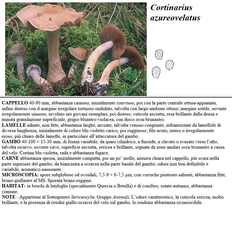 CAPPELLO 40-90 mm, abbastanza carnoso, inizialmente coneesso, poi con la parte centrale ottusa-appianata, infine disteso con il margine irregolare tortuoso-ondulato, talvolta con largo umbone ottuso, margine sottile, sovente irregolarmente sinuoso, involuto nei giovani esemplari, poi disteso, cuticola asciutta, resa brillante dalla densa e minuta granulazione superficiale, grigio-bluastro-violacea con disco ocra-brunastro. LAMELLE adnate, non fitte, abbastanza larghe, arcuate, talvolta cenoso-congiunte, inframezzate da lamellule di diversa lunghezza, inizialmente di colore blu-violetto carico, poi rugginose, filo acuto, intero o irregolarmente eroso, più chiaro delle lamelle, in particolare all'attaccatura del gambo. GAMBO 40-100 x 15-30 mm, di forma variabile, da quasi cilindrico, a fusoide, a clavato o svasato verso l'alto, talvolta ricurvo, sovente cavo, superficie asciutta, sericea e brillante, segnata da zone anulari ocra-brunastre a causa del velo. Cortina blu-violetta, rada e abbastanza fugace. CARNE abbastanza spessa, inizialmente compatta, poi un po' molle, azzurra chiara nel cappello, più scura nella parte superiore del gambo, da biancastra a ocracea nella parte basale del gambo, odore non ben definibile e variabile, aromatico-nauseante. MICROSCOPIA spore subglobose od ovoidali, 7,5-9 x 6-7,5 µm, con verruche piuttosto salienti, abbastanza fitte, bruno-giallastre al MS. Sporata bruno-ruggine. HABITAT in boschi di latifoglie (specialmente Quercia o Betulla) e di conifere, estate-autunno, abbastanza comune. NOTE - Appartiene al Sottogenere Sericeocybe, Gruppo Anomali. L'odore caratteristico, la cuticola sericea, molto brillante, e la presenza di residui siallo-ocracei del velo sul gambo, lo rendono abbastanza riconoscibile.