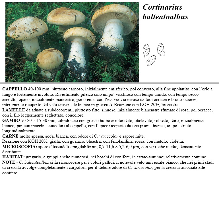 CAPPELLO 40-100 mm, piuttosto carnoso, inizialmente emisferico, poi convesso, alla fine appiattito, con l'orlo a lungo e fortemente involuto. Rivestimento pileico solo un po' vischioso con tempo umido, con tempo secco asciutto, opaco, inizialmente biancastro, poi crema, con l'età via via invaso da toni ocracei e bruno-ocracei, interamente ricoperto dal velo universale bianco in gioventù. Reazione con KOH 20%, brunastra. LAMELLE da adnate a subdecorrenti, piuttosto fitte, sinuose, inizialmente biancastre sfumate di rosa, poi ocracee, con il filo leggermente seghettato, concolore. GAMBO 50-80 x 15-30 mm, cilindraceo con grosso bulbo arrotondato, obclavato, robusto, duro, inizialmente bianco, poi con macchie concolori al cappello, con l'apice ricoperto da una pruina bianca, un po' striato longitudinalmente. CARNE molto spessa, soda, bianca, con odore di C. variecolor e sapore mite. Reazione con KOH 20%, gialla, con guaiaco, bluastra, con fenolanilina, rossa, con metolo, violetta. MICROSCOPIA spore ellissoidali-amigdaliformi, 8,7-11,6 x 5,2-6,0 µm, con verruche medie, densamente distribuite. HABITAT gregario, a gruppi anche numerosi, nei boschi di conifere, in estate-autunno, relativamente comune. NOTE - C. balteatoalbus si fa riconoscere per i colori pallidi, il notevole velo universale bianco, che nei primi stadi di crescita avvolge completamente i carpofori, per il debole odore di C variecolor, per la crescita associata alle conifere.