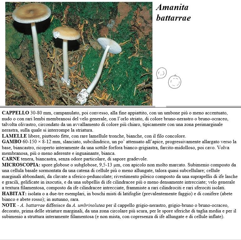 CAPPELLO 30-80 mm; campanulato, poi convesso, alla fine appiattito, con un umbone più o meno accentuato, nudo o con rari lembi membranosi del velo generale, con l'orlo striato, di colore bruno-nerastro o bruno-ocraceo, talvolta olivastro; circondato da un avvallamento di colore più chiaro, tipicamente con una zona perimarginale nerastra, sulla quale si interrompe la striatura. LAMELLE libere, piuttosto fitte, con rare lamellule tronche, bianche, con il filo concolore. GAMBO 60-150 x 8-12 mm, slanciato, subcilindrico, un po' attenuato all'apice, progressivamente allargato verso la base, biancastro, ricoperto interamente da una sottile forfora bianco-grigiastra, farcito-midolloso, poi cavo. Volva membranosa, più o meno aderente e inguainante, bianca. CARNE tenera, biancastra, senza odore particolare, di sapore gradevole. MICROSCOPIA spore globose o subslobose, 9,5-13 µm, con apicolo non molto marcato. Subimenio composto da una cellula basale sormontata da una catena di cellule più o meno allungate, talora quasi subcellulare; cellule marginali abbondanti, da clavate a sferico-peduncolate; rivestimento pileico composto da una suprapellis di ife lasche e gracili, gelificate in ixocutis, e da una subpellis di ife cilindracee più o meno densamente intrecciate; velo generale a textura filamentosa, composto da ife cilindracee intrecciate, frammiste a rari cilindrociti e rari sferociti isolati. HABITAT isolata o a due-tre esemplari, in boschi misti di latifoglie (prevalentemente faggio) e di conifere (abete bianco e abete rosso); in autunno, rara. NOTE - A. battarrae differisce da A. umbrinolutea per il cappello grigio-nerastro, grigio-bruno o bruno-ocraceo, decorato, prima delle striature marginali, da una zona circolare più scura, per le spore sferiche di taglia media e per il subimenio a struttura interamente filamentosa (e non mista con coopresenza di ife allungate e di cellule inflate).