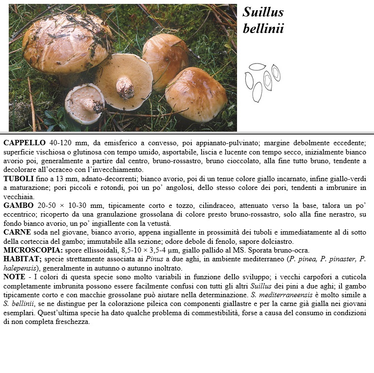 CAPPELLO 40-120 mm, da emisferico a convesso, poi appianato-pulvinato, margine debolmente eccedente, superficie vischiosa o glutinosa con tempo umido, asportabile, liscia e lucente con tempo secco, inizialmente bianco avorio poi, generalmente a partire dal centro, bruno-rossastro, bruno cioccolato, alla fine tutto bruno, tendente a decolorare all'ocraceo con l'invecchiamento. TUBOLI fino a 13 mm, adnato-decorrenti, bianco avorio, poi di un tenue colore giallo incarnato, infine giallo-verdi a maturazione, pori piccoli e rotondi, poi un po' angolosi, dello stesso colore dei pori, tendenti a imbrunire in vecchiaia. GAMBO 20-50 x 10-30 mm, tipicamente corto e tozzo, cilindraceo, attenuato verso la base, talora un po' eccentrico, ricoperto da una granulazione grossolana di colore presto bruno-rossastro, solo alla fine nerastro, su fondo bianco avorio, un po' ingiallente con la vetustà. CARNE soda nel giovane, bianco avorio, appena ingiallente in prossimità dei tuboli e immediatamente al di sotto della corteccia del gambo, immutabile alla sezione, odore debole di fenolo, sapore dolciastro. MICROSCOPIA spore ellissoidali, 8,5-10 x 3,5-4 µm, giallo pallido al MS. Sporata bruno-ocra. HABITAT specie strettamente associata ai Pinus a due aghi, in ambiente mediterraneo (P. pinea, P. pinaster, P. halepensis), generalmente in autunno o autunno inoltrato. NOTE - I colori di questa specie sono molto variabili in funzione dello sviluppo, i vecchi carpofori a cuticola completamente imbrunita possono essere facilmente confusi con tutti gli altri Suillus dei pini a due aghi, il gambo tipicamente corto e con macchie grossolane può aiutare nella determinazione. S. mediterraneensis è molto simile a S. bellinii, se ne distingue per la colorazione pileica con componenti giallastre e per la carne già gialla nei giovani esemplari. Quest'ultima specie ha dato qualche problema di commestibilità, forse a causa del consumo in condizioni di non completa freschezza.
