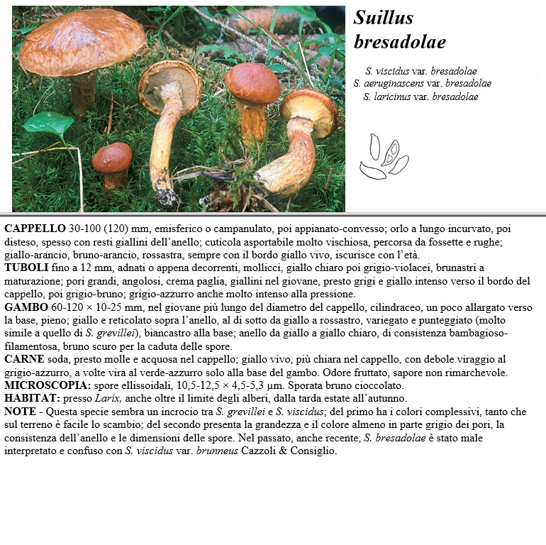 CAPPELLO 30-100 (120) mm, emisferico o campanulato, poi appianato-convesso, orlo a lungo incurvato, poi disteso, spesso con resti giallini dell'anello, cuticola asportabile molto vischiosa, percorsa da fossette e rughe, giallo-arancio, bruno-arancio, rossastra, sempre con il bordo giallo vivo, iscurisce con l'età. TUBOLI fino a 12 mm, adnati o appena decorrenti, mollicci, giallo chiaro poi grigio-violacei, brunastri a maturazione, pori grandi, angolosi, crema paglia, giallini nel giocane, presto grigi e giallo intenso verso il bordo del cappello, poi grigio-bruno, grigio-azzurro anche molto intenso alla pressione. GAMBO 60-120 x 10-25 mm, nel giovane più lungo del diametro del cappello, cilindraceo, un poco allargato verso la base, pieno, giallo e reticolato sopra 1'anello, al di sotto da giallo a rossastro, variegato e punteggiato (molto simile a quello di S. grevillei), biancastro alla base, anello da giallo a giallo chiaro, di consistenza bambagioso-filamentosa, bruno scuro per la caduta delle spore. CARNE soda, presto molle e acquosa nel cappello, giallo cico, più chiara nel cappello, con debole viraggio al grigio-azzurro, a volte vira al verde-azzurro solo alla base del gambo. Odore fruttato, sapore non rimarchevole. MICROSCOPIA spore ellissoidali, 10,5-12,5 x 4,5-5,3 µm. Sporata bruno cioccolato. HABITAT presso Larix, anche oltre il limite degli alberi, dalla tarda estate all'autunno. NOTE - Questa specie sembra un incrocio tra S. grevillei e S. viscidus,del primo ha i colori complessivi, tanto che sul terreno è facile lo scambio, del secondo presenta la grandezza e il colore almeno in parte grigio dei pori, la consistenza dell'anello e le dimensioni delle spore. Nel passato, anche recente, S. bresadolae è stato male interpretato e confuso con S. viscidus car. brunneus Cazzoli & Consiglio.