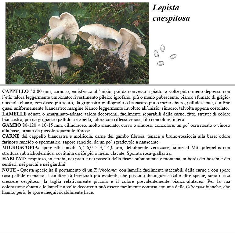 CAPPELLO 50-80 mm, carnoso, emisferico all'inizio, poi da convesso a piatto, a volte più o meno depresso con l'età, talora leggermente umbonato, rivestimento pileico igrofano, più o meno pubescente, bianco sfumato di grigio-nocciola chiaro, con disco più scuro, da grigiastro-giallognolo o brunastro più o meno chiaro, pallidescente, e infine quasi uniformemente biancastro, margine bianco leggermente involuto all'inizio, sinuoso, talvolta appena costolato. LAMELLE adnate o smarginato-adnate, talora decorrenti, facilmente separabili dalla carne, fitte, strette, di colore biancastro, poi da grigiastro pallido a isabella, talora con riflessi vinosi, filo concolore, intero. GAMBO 80-120 x 10-15 mm, cilindraceo, molto slanciato, curvo o sinuoso, concolore, un po' ocra rosato o vinoso alla base, ornato da piccole squamule fibrose. CARNE del cappello biancastra e molliccia, carne del gambo fibrosa, tenace e bruno-rossiccia alla base, odore farinoso rancido o spermatico, sapore rancido, da un po' sgradevole a nauseante. MICROSCOPIA spore ellissoidali, 5,4-6,0 x 3,5-4,0 µm, debolmente verrucose, ialine al MS, pileipellis con struttura subtrichodermica costituita da ife più o meno clavate. Sporata rosa-giallastra. HABITAT cespitoso, in cerchi, nei prati e nei pascoli della fascia submontana e montana, ai bordi dei boschi e dei sentieri, nei parchi e nei giardini. NOTE - Questa specie ha il portamento di un Tricholoma, con lamelle facilmente staccabili dalla carne e con spore rosa pallide in massa. I caratteri differenziali più evidenti, che possono distinguerla dalle altre specie, sono il suo crescere cespitoso, la taglia relativamente piccola e il colore prevalentemente bianco-alutaceo. Per la sua colorazione chiara e le lamelle a volte decorrenti può essere facilmente confusa con una delle Clitocybe bianche, che hanno, però, le spore inequivocabilmente lisce.