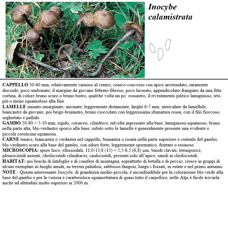 CAPPELLO 30-60 mm, relativamente carnoso al centro, conico-convesso con apice arrotondato, raramente discoide, poco umbonato, il margine da giovane feltrato-fibroso, poco lacerato, appendicolato-frangiato da una fitta cortina, di colore bruno scuro o bruno bistro, qualche volta un po' rossastro, il rivestimento pileico lanuginoso, irto, più o meno squamuloso alla fine. LAMELLE sinuato-smarginate, uncinate, leggermente distanziate, larghe 6-7 mm, intercalate da lamellule, biancastre da giovane, poi beige-brunastro, bruno cioccolato con leggerissima sfumatura rossa con il filo fioccoso, seghettato e pallido. GAMBO 50-80 x 5-10 mm, rigido, coriaceo, cilindrico, talvolta ingrossato alla base, lanuginoso-squamoso, bruno nella parte alta, blu-verdastro sporco alla base, subito sotto le lamelle è generalmente presente una evidente e piccola coroncina squamosa. CARNE tenace, biancastra o verdastra nel cappello, brunastra o rosata nella parte superiore e centrale del gambo, blu-verdastro scuro alla base del gambo, con odore forte, leggermente spermatico, fruttato o resinoso. MICROSCOPIA spore lisce, ellissoidali, 11,0-13,8 (15) x 5,5-6,5 (6,8) µm, basidi clavati, tetrasporici, pleurocistidi assenti, cheilocistidi cilindracei, caulocistidi, presenti solo all'apice, simili ai cheilocistidi. HABITAT nei boschi di latifoglie e di conifere di montagna, soprattutto di betulla e di peccio, cresce in gruppi di alcuni esemplari in luoghi umidi, su terreni paludosi, sabbioso-fangosi, lungo i fossati, in estate e nel primo autunno. NOTE - Questa interessante Inocybe, di grandezza medio-piccola, è inconfondibile per la colorazione blu-verde alla base del gambo e per la vistosa e caratteristica squamettatura di quasi tutto il carpoforo, nelle Alpi è facile trovarla anche ad altitudini molto superiori ai 2000 m