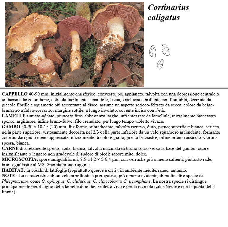 CAPPELLO 40-90 mm, inizialmente emisferico, convesso, poi appianato, talvolta con una depressione centrale o un basso e largo umbone, cuticola facilmente separabile, liscia, vischiosa e brillante con l'umidità, decorata da piccole fibrille e squamette più accentuate al disco, assume un aspetto sericeo-feltrato da secca, colore da beige-brunastro a fulvo-rossastro, margine sottile, a lungo involuto, sovente inciso con l'età. LAMELLE sinuato-adnate, piuttosto fitte, abbastanza larghe, inframezzate da lamellule, inizialmente biancastro sporco, argillacee, infine bruno-fulvo, filo crenulato, per lungo tempo violetto vivace. GAMBO 50-90 x 10-15 (20) mm, fusiforme, subradicante, talvolta ricurvo, duro, pieno, superficie bianca, sericea, nella parte superiore, vistosamente decorata nei 2/3 della parte inferiore da un velo squamoso ascendente, formante zone anulari più o meno appressate, inizialmente di colore giallo, presto brunastre, infine bruno-rossiccio. Cortina spessa, bianca. CARNE discretamente spessa, soda, bianca, talvolta maculata di bruno scuro verso la base del gambo, odore insignificante o leggero non gradevole di sudore di piedi, sapore mite, dolce. MICROSCOPIA- spore amigdaliformi, 8,5-11,2 x 5-6,4 µm, con verruche più o meno salienti, piuttosto rade, bruno-giallastre al MS. Sporata bruno-ruggine. HABITAT in boschi di latifoglie (soprattutto querce e cisti), in ambiente mediterraneo, autunno. NOTE - La caratteristica di un velo armilloide è prerogativa, più o meno evidente, di molte altre specie di Phlegmacium, come C. ophiopus, C. cliduchus, C. claricolor, o C. triumphans. La nostra specie si distingue principalmente per il taglio delle lamelle di un bel violetto vivo e per la cuticola dolce (sentire con la punta della lingua).