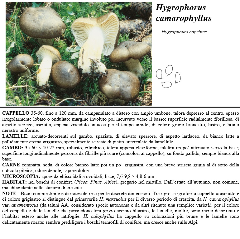 CAPPELLO 35-60, fino a 120 mm, da campanulato a disteso con ampio umbone, talora depresso al centro, spesso irregolarmente lobato o ondulato, margine involuto poi incurvato verso il basso, superficie radialmente fibrillosa, di aspetto sericeo, asciutta, appena viscidulo-untuosa per il tempo umido, di colore grigio brunastro, bistro, o bruno nerastro uniforme. LAMELLE arcuato-decorrenti sul gambo, spaziate, di elevato spessore, di aspetto lardaceo, da bianco latte a pallidamente crema grigiastro, specialmente se viste di piatto, intercalate da lamellule. GAMBO 35-60 x 10-22 mm, robusto, cilindrico, talora appena claviforme, talaltra un po' attenuato verso la base, superficie longitudinalmente percorsa da fibrine più scure (concolori al cappello), su fondo pallido, sempre bianca alla base. CARNE compatta, soda, di colore bianco latte poi un po' grigiastra, con una breve striscia grigia al di sotto della cuticola pileica, odore debole, sapore dolce. MICROSCOPIA spore da ellissoidali a ovoidali, lisce, 7,6-9,8 x 4,8-6 µm. HABITAT nei boschi di conifere (Picea, Pimis, Abies), gregario nel mirtillo. Dall'estate all'autunno, non comune, ma abbondante nelle stazioni di crescita. NOTE - Buon commestibile e di notevole resa per le discrete dimensioni. Tra i grossi igrofori a cappello più o meno asciutto e di colore grigiastro si distingue dal primaverile H. marzuolus per il diverso periodo di crescita, da H. camarophyllus var. atramentosus (da taluni AA. considerato specie autonoma e da altri ritenuto una semplice varietà), per il colore del cappello e delle lamelle che possiedono toni grigio acciaio bluastro, le lamelle, inoltre, sono meno decorrenti e l'habitat esteso anche alle latifoglie. H. calophyllus ha cappello su colorazioni più brune e le lamelle sono delicatamente rosate, sembra prediligere i boschi termofili di conifere, ma cresce anche sulle Alpi.