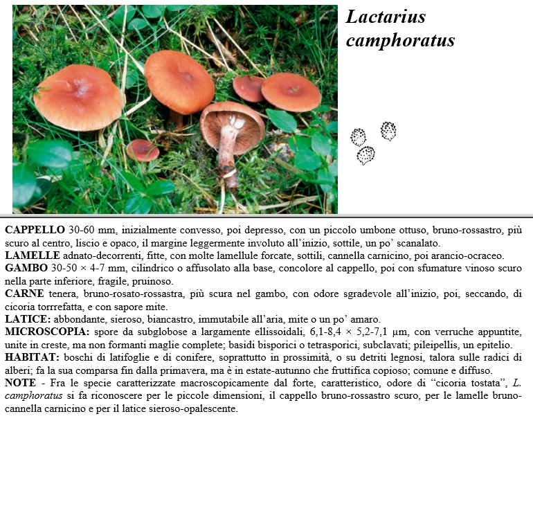 CAPPELLO 30-60 mm, inizialmente convesso, poi depresso, con un piccolo umbone ottuso, bruno-rossastro, più scuro al centro, liscio e opaco, il margine leggermente involuto all'inizio, sottile, un po' scanalato. LAMELLE adnato-decorrenti, fitte, con molte lamellule forcate, sottili, cannella carnicino, poi arancio-ocraceo. GAMBO 30-50 x 4-7 mm, cilindrico o affusolato alla base, concolore al cappello, poi con sfumature vinoso scuro nella parte inferiore, fragile, pruinoso. CARNE tenera, bruno-rosato-rossastra, più scura nel gambo, con odore sgradevole all'inizio, poi, seccando, di cicoria torrefatta e con sapore mite. LATTICE: abbondante, sieroso, biancastro, immutabile all'aria, mite o un po' amaro. MICROSCOPIA spore da subglobose a largamente ellissoidali, 6,1-8,4 x 5,2-7,1 µm, con verruche appuntite, unite in creste, ma non formanti maglie complete, basidi bisporici o tetrasporici, subclavati, pileipellis, un epitelio. HABITAT boschi di latifoglie e di conifere, soprattutto in prossimità, o su detriti legnosi, talora sulle radici di alberi, fa la sua comparsa fin dalla primavera, ma è in estate-autunno che fruttifica copioso, comune e diffuso. NOTE - Fra le specie caratterizzate macroscopicamente dal forte, caratterishco, odore di "cicoria tostata", L. camphoratus si fa riconoscere per le piccole dimensioni, il cappello bruno-rossastro scuro, per le lamelle bruno-cannella carnicino e per il latice sieroso-opalescente.