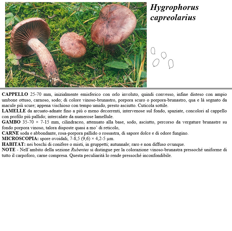CAPPELLO 25-70 mm, inizialmente emisferico con orlo involuto, quindi convesso, infine disteso con ampio umbone ottuso, carnoso, sodo, di colore vinoso-brunastro, porpora scuro o porpora-brunastro, qua e là segnato da macule più scure, appena vischioso con tempo umido, presto asciutto. Cuticola sottile. LAMELLE da arcuato-adnate fino a più o meno decorrenti, intervenose sul fondo, spaziate, concolori al cappello con profilo più pallido, intercalate da numerose lamellule. GAMBO 35-70 x 7-15 mm, cilindraceo, attenuato alla base, sodo, asciutto, percorso da vergature brunastre su fondo porpora vinoso, talora disposte quasi a mo' di reticolo, CARNE soda e abbondante, rosa-porpora pallido o rossastra, di sapore dolce e di odore fungino. MICROSCOPIA spore ovoidali, 7-8,5 (9,6) x 4,2-5 µm. HABITAT nei boschi di conifere o misti, in gruppetti, autunnale, raro e non diffuso ovunque. NOTE -Nell'ambito della sezione Rubentes si distingue per la colorazione vinoso-brunastra pressoché uniforme di tutto il carpoforo, carne compresa. Questa peculiarità lo rende pressoché inconfondibile.