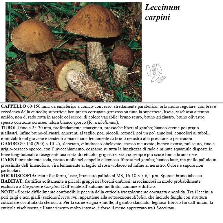 CAPPELLO 60-150 mm, da emisferico a conico-convesso, strettamente parabolico, orlo molto regolare, con breve eccedenza della cuticola, superficie ben presto corrugata-grinzosa su tutta la superficie, liscia, vischiosa a tempo umido, non di rado rotta in areole col secco, di colore variabile, bruno scuro, bruno grigiastro, bruno olicastro, spesso con zone ocracee, talora bianco sporco (fo. isabellinum). TUBOLI fino a 25-30 mm, profondamente smarginati, pressoché liberi al gambo, bianco-crema poi grigio-siallastri, infine bruno-olivastri, annerenti al taglio, pori piccoli, rotondi, poi un po' angolosi, concolori ai tuboli, immutabili nel giocane e tendenti a macchiarsi lentamente di bruno nerastro alla pressione o per traumi. GAMBO 80-150 (200) x 10-25, slanciato, cilindraceo-obclavato, spesso incurvato, bianco avorio, più scuro, fino a grigio-ocraceo sporco, con Pincecchiamento, cosparso su tutta la lunghezza di rade e minute squamule disposte in linee longitudinali o disegnanti una sorta di reticolo, grigiastre, via via sempre più scure fino a bruno-nere. CARNE inizialmente soda, presto molle nel cappello e legnoso-fibrosa nel gambo, bianco latte, ma giallo pallido in prossimità dell'imenoforo, vira lentamente al taglio al rosa violaceo ed infine al nerastro. Odore e sapore non particolari. MICROSCOPIA spore fusiformi, lisce, brunastro pallido al MS, 16-18 x 5-6,5 µm. Sporata bruno tabacco. HABITAT fruttifica solitamente a piccoli gruppi nei boschi ombrosi, associandosi in modo probabilmente esclusivo a Carpinus e Conlus. Dall'estate all'autunno inoltrato, comune e diffuso. NOTE - Specie difficilmente confondibile per via della cuticola irregolarmente corrugata e sordida. Tra i leccini a pori grigi e non gialli (sezione Leccinum), appartiene alla sottosezione Albella, che include funghi con struttura cuticolare costituita da sferocisti. Per la carne esigua e molle, il gambo slanciato, legnoso-fibroso fin dall'inizio, la cuticola vischiosetta e l'annerimento molto intenso, è forse il meno apprezzato tra i Leccinum.