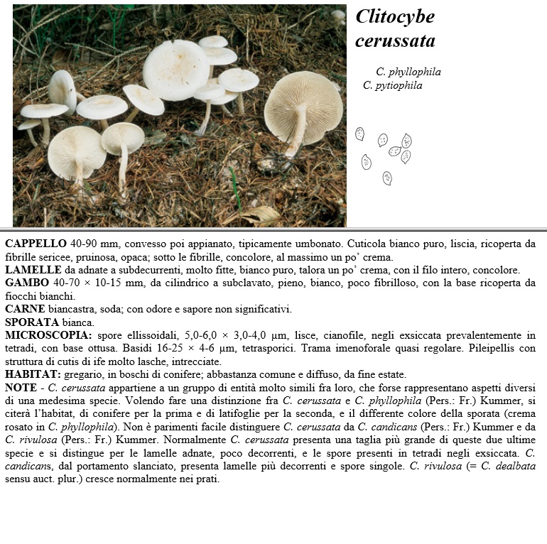 CAPPELLO 40-90 mm, convesso poi appianato, tipicamente umbonato. Cuticola bianco puro, liscia, ricoperta da fibrille sericee, pruinosa, opaca, sotto le fibrille, concolore, al massimo un po' crema. LAMELLE da adnate a subdecurrenti, molto fitte, bianco puro, talora un po' crema, con il filo intero, concolore. GAMBO 40-70 x 10-15 mm, da cilindrico a subclavato, pieno, bianco, poco fibrilloso, con la base ricoperta da fiocchi bianchi. CARNE biancastra, soda, con odore e sapore non significatici. SPORATA bianca. MICROSCOPIA spore ellissoidali, 5,0-6,0 x 3,0-4,0 µm, lisce, cianofile, negli exsiccata prevalentemente in tetradi, con base ottusa. Basidi 16-25 x 4-6 µm, tetrasporici. Trama imenoforale quasi regolare. Pileipellis con struttura di cutis di ife molto lasche, intrecciate. HABITAT gregario, in boschi di conifere, abbastanza comune e diffuso, da fine estate. NOTE - C. cerussata appartiene a un gruppo di entità molto simili fra loro, che forse rappresentano aspetti diversi di una medesima specie. Volendo fare una distinzione fra C. cerussata e C. phyllophila (Pers.: Fr.) Kummer, si citerà l'habitat, di conifere per la prima e di latifoglie per la seconda, e il differente colore della sporata (crema rosato in C. phyIlophila). Non è parimenti facile distinguere C. cerussata da C. candicans (Pers.: Fr.) Kummer e da C. rivulosa (Pers.: Fr.) Kummer. Normalmente C. cerussata presenta una taglia più grande di queste due ultime specie e si distingue per le lamelle adnate, poco decorrenti, e le spore presenti in tetradi negli exsiccata. C. candicans, dal portamento slanciato, presenta lamelle più decorrenti e spore singole. C rivulosa (C. dealbata sensu auct. plur.) cresce normalmente nei prati.