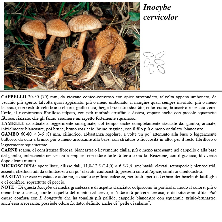 CAPPELLO 30-50 (70) mm, da giovane conico-convesso con apice arrotondato, talvolta appena umbonato, da vecchio più aperto, talvolta quasi appianato, più o meno umbonato, il margine quasi sempre involuto, più o meno lacerato, con resti di velo bruno chiaro, giallo-ocra, beige-brunastro sbiadito, color cuoio, brunastro-rossiccio verso l'orlo, il rivestimento fibrilloso-felpato, con peli morbidi arruffati e distesi, oppure anche con piccole squamette fibrose, rialzate, che gli fanno assumere un aspetto fortemente squamoso. LAMELLE da adnate a leggermente smarginate, col tempo anche completamente staccate dal gambo, arcuate, inizialmente biancastre, poi brune, bruno rossiccio, bruno ruggine, con il filo più o meno ondulato, biancastro. GAMBO 60-80 x 3-6 (8) mm, cilindrico, abbastanza regolare, a volte un po' attenuato alla base o leggermente bulboso, da ocra a bruno, più o meno arrossante alla base, con striature o fioccosità in alto, per il resto fibrilloso o leggermente squamettato. CARNE scarsa, di consistenza fibrosa, biancastra o lievemente gialla più o meno arrossante nel cappello e alla base del gambo, imbrunente nei vecchi esemplari, con odore forte di terra o muffa. Reazione, con il guaiaco, blu-verde dopo alcuni minuti. MICROSCOPIA spore lisce, ellissoidali, 11,0-12,5 (14,0) x 6,5-7,6 µm, basidi clavati, tetrasponci, pleurocistidi assenti, cheilocistidi da cilindracei a un po' clavati, caulocistidi, presenti solo all'apice, simili ai cheilocistidi. HABITAT cresce in estate e autunno, su suolo argilloso calcareo, nei tratti aperti ed erbosi dei boschi di latifoglie e di conifere, soprattutto di peccio. NOTE - Di questa Inocybe di media grandezza e di aspetto slanciato, colpiscono in particolar modo il colore, più o meno bruno carico, simile a quello del manto del cervo, e l'odore di polvere, terroso, o di botte ammuffita. Può essere confusa con L. bongardii che ha tonalità più pallide, cappello biancastro con squamule grigio-brunastre. anch'essa arrossante. possiede odore fruttato, definito anche di "pelle di salame".