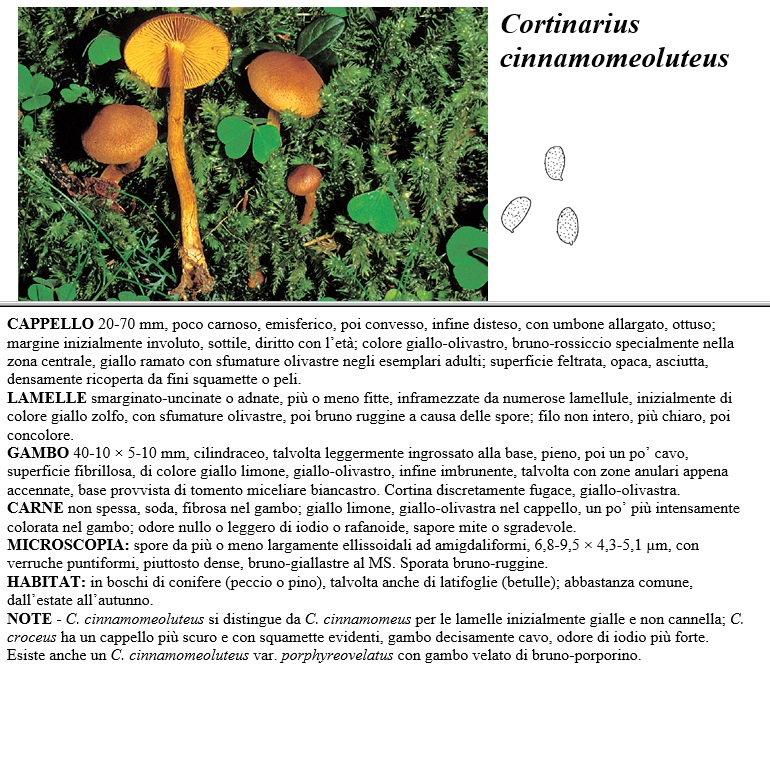 CAPPELLO 20-70 mm, poco carnoso, emisferico, poi convesso, infine disteso, con umbone allargato, ottuso, margine inizialmente involuto, sottile, diritto con l'età, colore giallo-olivastro, bruno-rossiccio specialmente nella zona centrale, giallo ramato con sfumature olivastre negli esemplari adulti, superficie feltrata, opaca, asciutta, densamente ricoperta da fini squamette o peli. LAMELLE smarginato-uncinate o adnate, più o meno fitte, inframezzate da numerose lamellule, inizialmente di colore giallo zolfo, con sfumature olivastre, poi bruno ruggine a causa delle spore, filo non intero, più chiaro, poi concolore. GAMBO 40-10 x 5-10 mm, cilindraceo, talvolta leggermente ingrossato alla base, pieno, poi un po' cavo, superficie fibrillosa, di colore giallo limone, giallo-olivastro, infine imbrunente, talvolta con zone anulari appena accennate, base provvista di tomento miceliare biancastro. Cortina discretamente fugace, giallo-olivastra. CARNE non spessa, soda, fibrosa nel gambo, giallo limone, giallo-olivastra nel cappello, un po' più intensamente colorata nel gambo, odore nullo o leggero di iodio o rafanoide, sapore mite o sgradevole. MICROSCOPIA spore da più o meno largamente ellissoidali ad amigdaliformi, 6,8-9,5 x 4,3-5,1 µm, con verruche puntiformi, piuttosto dense, bruno-giallastre al MS. Sporata bruno-ruggine. HABITAT in boschi di conifere (peccio o pino), talvolta anche di latifoglie (betulle), abbastanza comune, dall'estate all'autunno. NOTE - C. cinnamomeoluteus si distingue da C. cinnamomeus per le lamelle inizialmente gialle e non cannella, C. croceus ha un cappello più scuro e con squamette evidenti, gambo decisamente cavo, odore di iodio più forte. Esiste anche un C. cinnamomeoluteus var. porphyreovelatus con gambo velato di bruno-porporino.