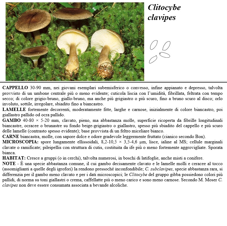 CAPPELLO 30-90 mm, nei giovani esemplari subemisferico o convesso, infine appianato e depresso, talvolta provvisto di un umbone centrale più o meno evidente, cuticola liscia con l'umidità, fibrillata, feltrata con tempo secco, di colore grigio-bruno, giallo-bruno, ma anche più grigiastro o più scuro, fino a bruno scuro al disco, orlo involuto, sottile, irregolare, sbiadito fino a biancastro. LAMELLE fortemente decorrenti, moderatamente fitte, larghe e carnose, inizialmente di colore biancastro, poi giallastro pallido od ocra pallido. GAMBO 40-80 x 5-20 mm, clavato, pieno, ma abbastanza molle, superficie ricoperta da fibrille longitudinali biancastre, ocracee o brunastre su fondo beige-srigiastro o giallastro, spesso più sbiadito del cappello e più scuro delle lamelle (contrasto spesso evidente), base provvista di un feltro miceliare bianco. CARNE biancastra, molle, con sapore dolce e odore gradevole leggermente fruttato (cianico secondo Bon). MICROSCOPIA spore lungamente ellissoidali, 8,2-10,5 x 3,5-4,6 µm, lisce, ialine al MS, cellule marginali clavate o ramificate, pileipellis con struttura di cutis, costituita da ife più o meno fortemente aggrovigliate Sporata bianca. HABITAT Cresce a gruppi (o in cerchi), talvolta numerosi, in boschi di latifoglie, anche misti a conifere. NOTE - E una specie abbastanza comune, il cui gambo decisamente clavato e le lamelle molli e ceracee al tocco (assomiglianti a quelle degli igrofori) la rendono pressoché inconfondibile, C. subclavipes, specie abbastanza rara, si differenzia per il gambo meno clavato e per i dati microscopici, le Clitocybe del gruppo gibba possiedono colori più pallidi, di norma su toni giallastri o crema, caffellatte più o meno carico e sono meno carnose. Secondo M. Moser, C. clavipes non deve essere consumata associata a bevande alcoliche.