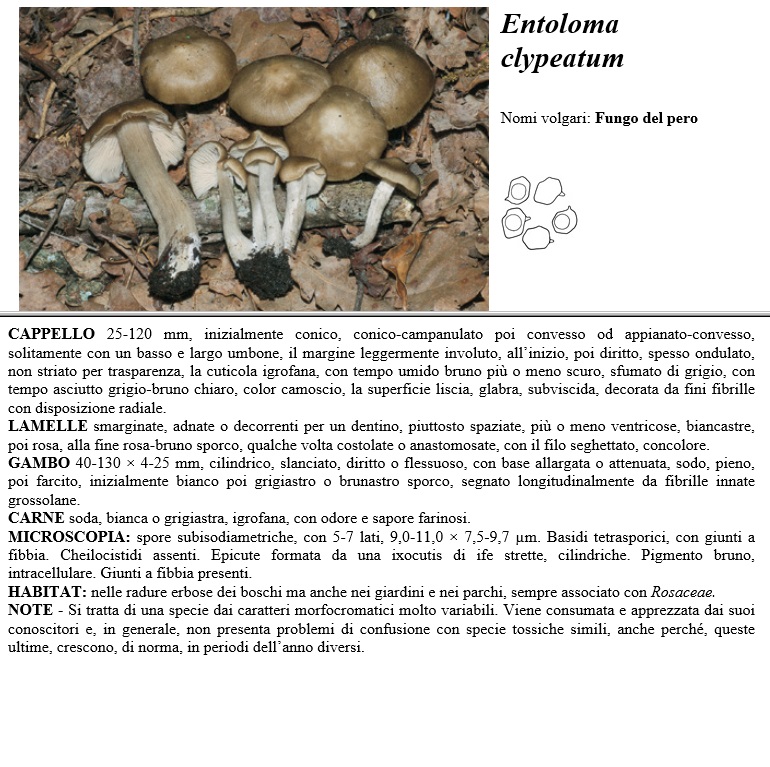 CAPPELLO 25-120 mm, inizialmente conico, conico-campanulato poi convesso od appianato-convesso, solitamente con un basso e largo umbone, il margine leggermente involuto,all'inizio, poi diritto, spesso ondulato, non striato per trasparenza, la cuticola igrofana, con tempo umido bruno più o meno scuro, sfumato di grigio, con tempo asciutto grigio-bruno chiaro, color camoscio, la superficie liscia, glabra, subciscida, decorata da fini fibrille con disposizione radiale. LAMELLE smarginate, adnate o decorrenti per un dentino, piuttosto spaziate, più o meno ventricose, biancastre, poi rosa, alla fine rosa-bruno sporco, qualche volta costolate o anastomosate, con il filo seghettato, concolore. GAMBO 40-130 x 4-25 mm, cilindrico, slanciato, diritto o flessuoso, con base allargata o attenuata, sodo, pieno, poi farcito, inizialmente bianco poi grigiastro o brunastro sporco, segnato longitudinalmente da fibrille innate ¢rossolane. CARNE soda, bianca o grigiastra, igrofana, con odore e sapore farinosi. MICROSCOPIA spore subisodiametriche, con 5-7 Iati, 9,0-11,0 x 7,5-9,7 µm. Basidi tetrasporici, con giunti a fibbia. Cheilocistidi assenti. Epicute formata da una ixocutis di ife strette, cilindriche. Pigmento bruno, intracellulare. Giunti a fibbia presenti. HABITAT nelle radure erbose dei boschi ma anche nei giardini e nei parchi, sempre associato con Rosaceae. NOTE - Si tratta di una specie dai caratteri morfocromatici molto variabili. Viene consumata e apprezzata dai suoi conoscitori e, in generale, non presenta problemi di confusione con specie tossiche simili, anche perché, queste ultime, crescono, di norma, in periodi dell'anno diversi.