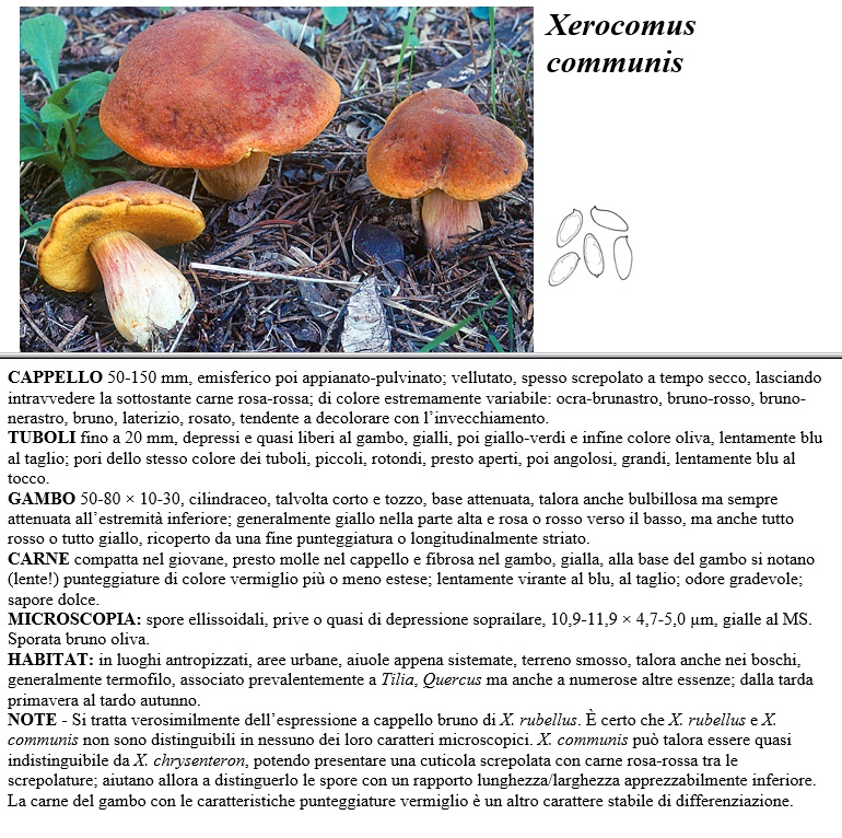 CAPPELLO 50-150 mm, emisferico poi appianato-pulvinato, vellutato, spesso screpolato a tempo secco, lasciando intravvedere la sottostante carne rosa-rossa, di colore estremamente variabile, ocra-brunastro, bruno-rosso, bruno-nerastro, bruno, laterizio, rosato, tendente a decolorare con l'invecchiamento. TUBOLI fino a 20 mm, depressi e quasi liberi al gambo, gialli, poi giallo-verdi e infine colore oliva, lentamente blu al taglio, pori dello stesso colore dei tuboli, piccoli, rotondi, presto aperti, poi angolosi, grandi, lentamente blu al tocco. GAMBO 50-80 x 10-30, cilindraceo, talvolta corto e tozzo, base attenuata, talora anche bulbillosa ma sempre attenuata all'estremità inferiore, generalmente giallo nella parte alta e rosa o rosso verso il basso, ma anche tutto rosso o tutto giallo, ricoperto da una fine punteggiatura o longitudinalmente striato. CARNE compatta nel giovane, presto molle nel cappello e fibrosa nel gambo, gialla, alla base del gambo si notano (lente) punteggiature di colore vermiglio più o meno estese, lentamente virante al blu, al taglio, odore gradevole, sapore dolce. MICROSCOPIA spore ellissoidali, prive o quasi di depressione soprailare, 10,9-11,9 x 4,7-5,0 µm, gialle al MS. Sporata bruno oliva. HABITAT in luoghi antropizzati, aree urbane, aiuole appena sistemate, terreno smosso, talora anche nei boschi, generalmente termofilo, associato prevalentemente a Tilia, Quercus ma anche a numerose altre essenze, dalla tarda primavera al tardo autunno. NOTE - Si tratta verosimilmente dell'espressione a cappello bruno di X. rubellus. E' certo che X. rubellus e X. communis non sono distinguibili in nessuno dei loro caratteri microscopici. X. communis può talora essere quasi indistinguibile da X chrysenteron, potendo presentare una cuticola screpolata con carne rosa-rossa tra le screpolature, aiutano allora a distinguerlo le spore con un rapporto lunghezza larghezza apprezzabilmente inferiore. La carne del gambo con le caratteristiche punteggiature vermiglio è un altro carattere stabile di differenziazione.