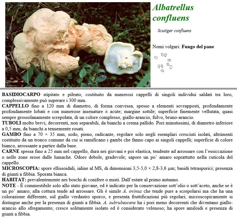 BASIDIOCARPO stipitato e pileato; costituito da numerosi cappelli di singoli individui saldati tra loro; complessivamente può superare i 300 mm. CAPPELLO fino a 120 mm di diametro, di forma convessa, spesso a elementi sovrapposti, profondamente lobati e con numerose insenature più o meno acute; margine sottile; superficie finemente cellutata, quasi sempre grossolanamente screpolata di un colore complesso, giallo-arancio, fulvo, bruno-arancio. TUBOLI molto brevi; decorrenti, non separabili, da bianchi a crema pallido. Pori minutissimi, di diametro inferiore a 0.5 mm. da bianchi a tenuemente rosati. GAMBO fino a 70 x 35 mm, sodo, pieno; radicante; regolare solo negli esemplari cresciuti isolati; altrimenti costituito da un tronco comune da cui si ramificano i gambi che fanno capo ai singoli cappelli; superficie di colore bianco, arrossante a partire dalla base. CARNE spessa fino a 25 mm nel cappello, dura nei giovani e poi elastica; tendente ad arrossare con 1'essiccazione o nelle zone erose dalle lumache. Odore debole, gradevole: sapore un po' amaro soprattutto nella cuticola del cappello. MICROSCOPIA spore ellissoidali; ialine al MS, di dimensioni 3,5-5,0 x 2,8-3,6 µm; basidi tetrasporici; presenza di giunti a fibbia. Sporata bianca. HABITAT prevalentemente nei boschi di conifere o misti. Dall'estate al primo autunno. NOTE - E' commestibile solo allo stato giovane, ed è indicato per la conservazione sott'olio o sott'aceto, anche se è un po' amaro; alla cottura tende ad arrossare. Gli è simile A.ovinus che tende pure a screpolarsi ma che ha una colorazione differente; sul giallo verdastro sporco, e presenta fruttificazioni più regolari; microscopicamente si distingue anche per la presenza di giunti a fibbia. A. subrubescens ha i pori meno decorrenti che diventano giallo-arancio allo sfregamento; cresce solitamente isolato ed è considerato velenoso: ha spore amiloidi e presenza di giunti a fibbia.
