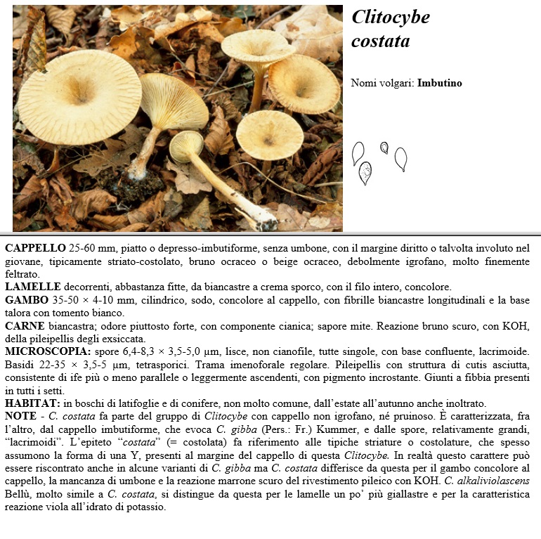CAPPELLO 25-60 mm, piatto o depresso-imbutiforme, senza umbone, con il margine diritto o talvolta involuto nel giovane, tipicamente striato-costolato, bruno ocraceo o beige ocraceo, debolmente igrofano, molto finemente feltrato. LAMELLE decorrenti, abbastanza fitte, da biancastre a crema sporco, con il filo intero, concolore. GAMBO 35-50 x 4-10 mm, cilindrico, sodo, concolore al cappello, con fibrille biancastre longitudinali e la base talora con tomento bianco. CARNE biancastra, odore piuttosto forte, con componente cianica, sapore mite. Reazione bruno scuro, con KOH, della pileipellis degli exsiccata. MICROSCOPIA spore 6,4-8,3 x 3,5-5,0 µm, lisce, non cianofile, tutte singole, con base confluente, lacrimoide. Basidi 22-35 x 3,5-5 µm, tetrasporici. Trama imenoforale regolare. Pileipellis con struttura di cutis asciutta, consistente di ife più o meno parallele o leggermente ascendenti, con pigmento incrostante. Giunti a fibbia presenti in tutti i setti. HABITAT in boschi di latifoglie e di conifere, non molto comune, dall'estate all'autunno anche inoltrato. NOTE - C. costata fa parte del gruppo di Clitocybe con cappello non igrofano, né pruinoso. È caratterizzata, fra l'altro, dal cappello imbutiforme, che evoca C. gibba (Pers.: Fr.) Kummer, e dalle spore, relativamente grandi, "lacrimoidi". L'epiteto "costata" (costolata) fa riferimento alle tipiche striature o costolature, che spesso assumono la forma di una Y, presenti al margine del cappello di questa Clitocybe. In realtà questo carattere può essere riscontrato anche in alcune varianti di C. gibba ma C. costata differisce da questa per il gambo concolore al cappello, la mancanza di umbone e la reazione marrone scuro del rivestimento pileico con KOH. C. alkaliviolascens, molto simile a C. costata, si distingue da questa per le lamelle un po' più giallastre e per la caratteristica reazione viola all' idrato di potassio.