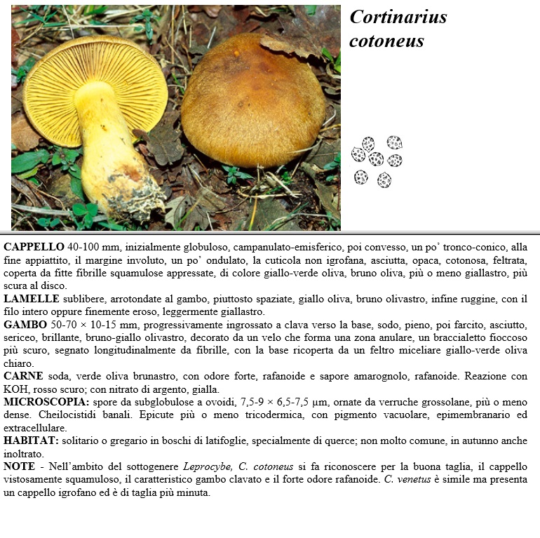 CAPPELLO 40-100 mm, inizialmente globuloso, campanulato-emisferico, poi convesso, un po' tronco-conico, alla fine appiattito, il margine involuto, un po' ondulato, la cuticola non igrofana, asciutta, opaca, cotonosa feltrata, coperta da fitte fibrille squamulose appressate, di colore giallo-verde oliva, bruno oliva, più o meno giallastro, più scura al disco. LAMELLE sublibere, arrotondate al gambo, piuttosto spaziate, giallo oliva, bruno olicastro, infine ruggine, con il filo intero oppure finemente eroso, leggermente giallastro. GAMBO 50-70 x 10-15 mm, progressivamente ingrossato a clava verso la base, sodo, pieno, poi farcito, asciutto, sericeo, brillante, bruno-giallo olivastro, decorato da un velo che forma una zona anulare, un braccialetto fioccoso più scuro, segnato longitudinalmente da fibrille, con la base ricoperta da un feltro miceliare giallo-verde oliva chiaro. CARNE soda, verde oliva brunastro, con odore forte, rafanoide e sapore amarognolo, rafanoide. Reazione con KOH, rosso scuro, con nitrato di argento, gialla. MICROSCOPIA spore da subslobulose a ovoidi, 7,5-9 x 6,5-7,5 µm, ornate da verruche orossolane, più o meno dense. Cheilocistidi banali. Epicute più o meno tricodermica, con pigmento cacuolare, epimembranario ed extracellulare. HABITAT solitario o gregario in boschi di latifoglie, specialmente di querce, non molto comune, in autunno anche inoltrato. NOTE - Nell'ambito del sottogenere Leprocybe, C. cotoneus si fa riconoscere per la buona taglia, il cappello vistosamente squamuloso, il caratteristico gambo clavato e il forte odore rafanoide. C. venetus è simile ma presenta un cappello igrofano ed è di taglia più minuta.