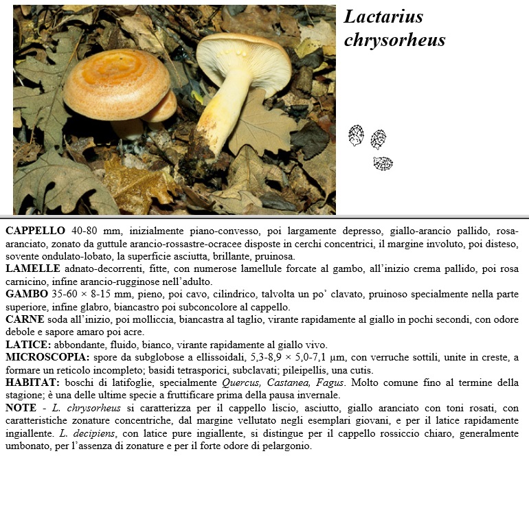 CAPPELLO 40-80 mm, inizialmente piano-convesso, poi largamente depresso, giallo-arancio pallido, rosa-aranciato, zonato da guttule arancio-rossastre-ocracee disposte in cerchi concentrici, il margine involuto, poi disteso, sovente ondulato-lobato, la superficie asciutta, brillante, pruinosa. LAMELLE adnato-decorrenti, fitte, con numerose lamellule forcate al gambo, all'inizio crema pallido, poi rosa carnicino, infine arancio-rugginose nell'adulto. GAMBO 35-60 x 8-15 mm, pieno, poi cavo, cilindrico, talvolta un po' clavato, pruinoso specialmente nella parte superiore, infine glabro, biancastro poi subconcolore al cappello. CARNE soda all'inizio, poi molliccia biancastra al taglio, virante rapidamente al giallo in pochi secondi, con odore debole e sapore amaro poi acre. LATTICE abbondante, fluido, bianco, virante rapidamente al giallo vivo. MICROSCOPIA spore da subglobose a ellissoidali, 5,3-8,9 x 5,0-7,l µm, con verruche sottili, unite in creste, a formare un reticolo incompleto, basidi tetrasporici, subclavati, pileipellis, una cutis. HABITAT boschi di latifoslie, specialmente Quercus, Castanea, Fagus. Molto comune fino al termine della stagione, è una delle ultime specie a fruttificare prima della pausa invernale. NOTE - L. chrysorheus si caratterizza per il cappello liscio, asciutto, giallo aranciato con toni rosati, con caratteristiche zonature concentriche, dal margine vellutato negli esemplari giovani, e per il latice rapidamente ingiallente. L. decipiens, con lattice pure ingiallente, si distingue per il cappello rossiccio chiaro, generalmente umbonato, per l'assenza di zonature e per il forte odore di pelargonio.