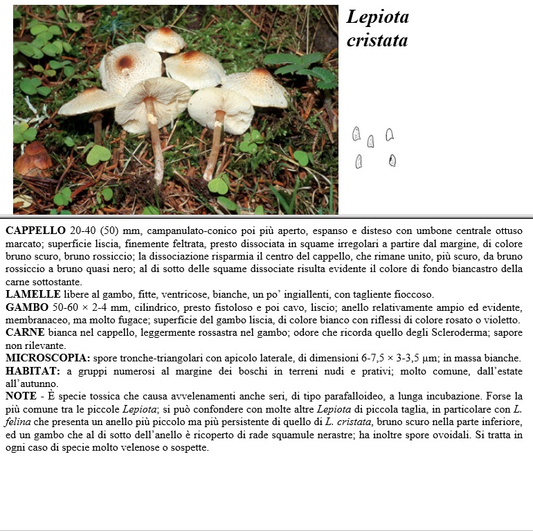 CAPPELLO 20-40 (50) mm, campanulato-conico poi più aperto, espanso e disteso con umbone centrale ottuso marcato, superficie liscia, finemente feltrata presto dissociata in squame irregolari a partire dal margine, di colore bruno scuro, bruno rossiccio, la dissociazione risparmia il centro del cappello, che rimane unito, più scuro, da bruno rossiccio a bruno quasi nero, al di sotto delle squame dissociate risulta evidente il colore di fondo biancastro della carne sottostante. LAMELLE libere al gambo, fitte, centricose, bianche, un po' ingiallenti, con tagliente fioccoso. GAMBO 50-60 x 2-4 mm, cilindrico, presto fistoloso e poi cavo, liscio, anello relativamente ampio ed ecidente, membranaceo, ma molto fugace, superficie del gambo liscia, di colore bianco con riflessi di colore rosato o violetto. CARNE bianca nel cappello, leggermente rossastra nel gambo; odore che ricorda quello degli Scleroderma; sapore non rilevante. MICROSCOPIA spore tronche-triangolari con apicolo laterale, di dimensioni 6-7,5 x 3-3,5 µm, in massa bianche. HABITAT a gruppi numerosi al margine dei boschi in terreni nudi e pratici, molto comune, dall'estate all' autunno. NOTE - E specie tossica che causa avvelenamenti anche seri, di tipo parafalloideo, a lunga incubazione. Forse la più comune tra le piccole Lepiota, si può confondere con molte altre Lepiota di piccola taglia, in particolare con L. felina che presenta un anello più piccolo ma più persistente di quello di L. cristata, bruno scuro nella parte inferiore, ed un gambo che al di sotto dell'anello è ricoperto di rade squamule nerastre, ha inoltre spore ovoidali. Si tratta in ogni caso di specie molto velenose o sospette.