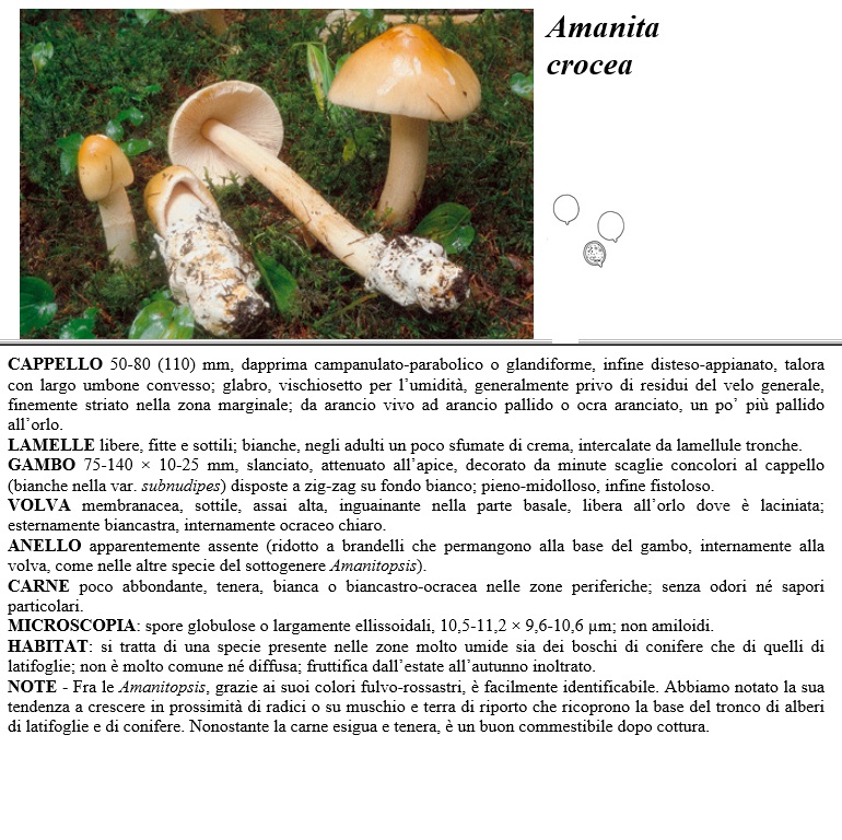 CAPPELLO 50-80 (110) mm; dapprima campanulato-parabolico o glandiforme; infine disteso-appianato, talora con largo umbone convesso; glabro; vischiosetto per l'umidità generalmente privo di residui del velo generale; finemente striato nella zona marginale; da arancio vivo ad arancio pallido o ocra aranciato, un po' più pallido all'orlo. LAMELLE libere, fitte e sottili; bianche, negli adulti un poco sfumate di crema, intercalate da lamellule tronche. GAMBO 75-140 x 10-25 mm, slanciato, attenuato all'apice; decorato da minute scaglie concolori al cappello (bianche nella var. submídipes) disposte a zig-zag su fondo bianco; pieno-midolloso, infine fistoloso. VOLVA membranacea, sottile, assai alta, inguainante nella parte basale, libera all'orlo dove è laciniata; esternamente biancastra. internamente ocraceo chiaro. ANELLO apparentemente assente (ridotto a brandelli che permangono alla base del gambo, internamente alla volva come nelle altre specie del sottogenere Amanitopsis). CARNE poco abbondante, tenera; bianca o biancastro-ocracea nelle zone periferiche; senza odori né sapori particolari. MICROSCOPIA spore globulose o largamente ellissoidali; 10,5-11,2 x 9,6-10,6 µm; non amiloidi. HABITAT si tratta di una specie presente nelle zone molto umide sia dei boschi di conifere che di quelli di latifoglie: non è molto comune né diffusa; fruttifica dall'estate all'autunno inoltrato. NOTE - Fra le Amanitopsis, grazie ai suoi colori fulvo-rossastri, è facilmente identificabile. Abbiamo notato la sua tendenza a crescere in prossimità di radici o su muschio e terra di riporto che ricoprono la base del tronco di alberi di latifoglie e di conifere. Nonostante la carne esigua e tenera; è un buon commestibile dopo cottura