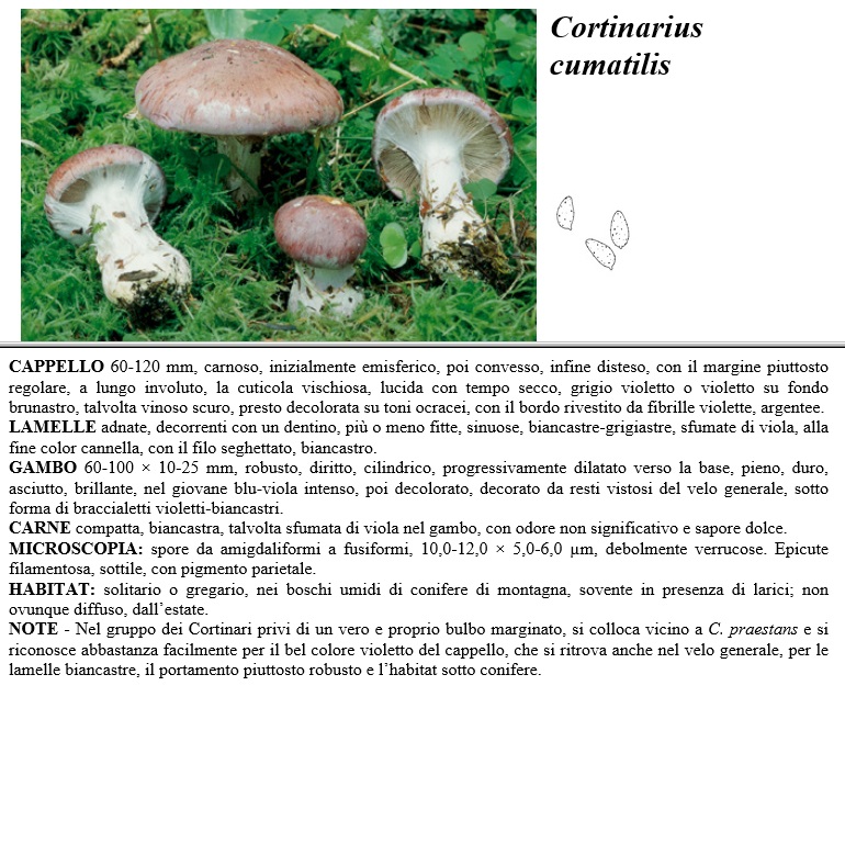 CAPPELLO 60-120 mm, carnoso, inizialmente emisferico, poi convesso, infine disteso, con il margine piuttosto regolare, a lungo insoluto, la cuticola vischiosa, lucida con tempo secco, grigio violetto o violetto su fondo brunastro, talvolta vinoso scuro, presto decolorata su toni ocracei, con il bordo rivestito da fibrille violette, argentee. LAMELLE adnate, decorrenti con un dentino, più o meno fitte, sinuose, biancastre-grigiastre, sfumate di viola, alla fine color cannella, con il filo seghettato, biancastro. GAMBO 60-100 x 10-25 mm, robusto, diritto, cilindrico, progressivamente dilatato verso la base, pieno, duro, asciutto, brillante, nel giocane blu-viola intenso, poi decolorato, decorato da resti vistosi del velo generale, sotto forma di braccialetti violetti-biancastri. CARNE compatta, biancastra, talvolta sfumata di viola nel gambo, con odore non significativo e sapore dolce. MICROSCOPIA spore da amigdaliformi a fusiformi, 10,0-12,0 x 5,0-6,0 µm, debolmente verrucose. Epicute filamentosa, sottile, con pigmento parietale. HABITAT solitario o gregario, nei boschi umidi di conifere di montagna, sovente in presenza di larici, non ovunque diffuso, dall'estate. NOTE - Nel gruppo dei Cortinari privi di un vero e proprio bulbo marginato, si colloca vicino a C. praestans e si riconosce abbastanza facilmente per il bel colore violetto del cappello, che si ritrova anche nel velo generale, per le lamelle biancastre, il portamento piuttosto robusto e l'habitat sotto conifere.