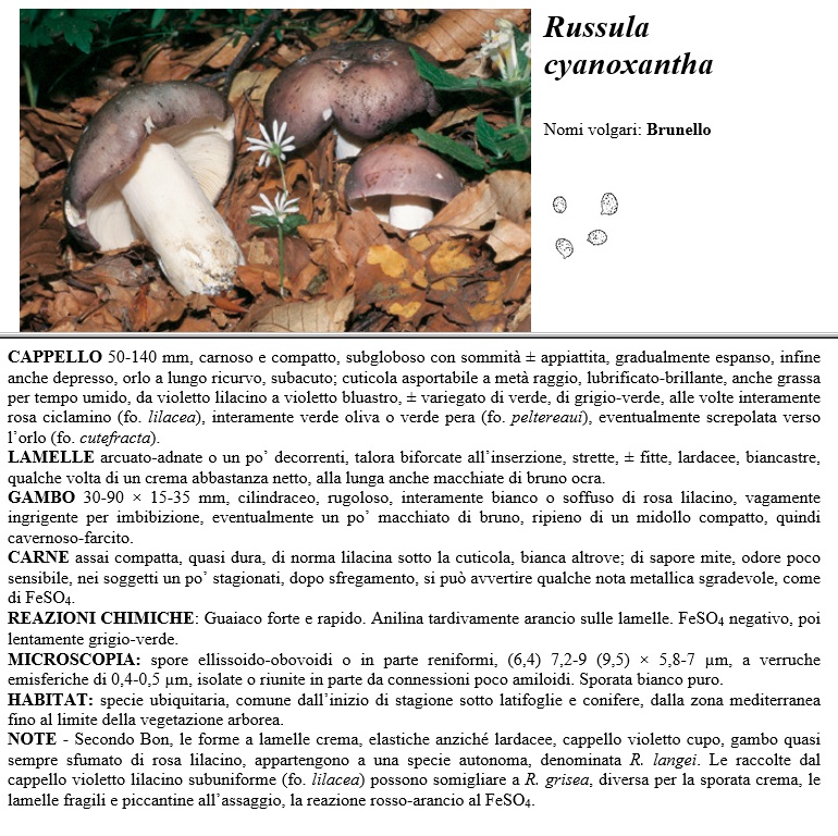CAPPELLO 50-140 mm; carnoso e compatto, subgloboso con sommità più o meno appiattita; gradualmente espanso, infine anche depresso, orlo a lungo ricurvo, subacuto; cuticola asportabile a metà raggio; lubrificato-brillante, anche grassa per tempo umido, da violetto lilacino a violetto bluastro, più o meno variegato di verde, di grigio-verde, alle volte interamente rosa ciclamino (lilacea), interamente verde oliva o verde pera (peltereaui), eventualmente screpolata verso l'orlo (cutefracta). LAMELLE arcuato-adnate o un po' decorrenti, talora biforcate all'inserzione, strette, più o meno fitte; lardacee; biancastre; qualche volta di un crema abbastanza netto; alla lunga anche macchiate di bruno ocra. GAMBO 30-90 x 15-35 mm. cilindraceo. rugoloso. interamente bianco o soffuso di rosa lilacino. vagamente ingrigente per imbibizione, eventualmente un po' macchiato di bruno, ripieno di un midollo compatto, quindi cavernoso-farcito. CARNE assai compatta; quasi dura; di norma lilacina sotto la cuticola; bianca altrove: di sapore mite; odore poco sensibile; nei soggetti un po' stagionati, dopo sfregamento; si può avvertire qualche nota metallica sgradevole; come di FeSO4 REAZIONI CHIMICHE Guaiaco forte e rapido. Anilina tardivamente arancio sulle lamelle. FCS04 negativo. poi lentamente grigio-verde. MICROSCOPIA spore ellissoido-obovoidi o in parte reniformi, (6,4) 7,2-9 (9,5) x 5,8-7 µm; a verruche emisferiche di 0,4-0,5 µm; isolate o riunite in parte da connessioni poco amiloidi. Sporata bianco puro. HABITAT: specie ubiquitaria; comune dall'inizio di stagione sotto latifoglie e conifere, dalla zona mediterranea fino al limite della vegetazione arborea. NOTE - Secondo Bon, le forme a lamelle crema, elastiche anziché lardacee, cappello violetto cupo; gambo quasi sempre sfumato di rosa lilacino, appartengono a una specie autonoma, denominata R. langei. Le raccolte dal cappello violetto lilacino subuniforme (lilacea) possono somigliare a R. grisea; diversa per la sporata crema le lamelle fragili e piccantine all'assagsio; la reazione rosso-arancio al FeSO4.
