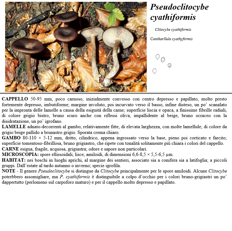 CAPPELLO 50-95 mm, poco carnoso, inizialmente convesso con centro depresso e papillato, molto presto fortemente depresso, imbutiforme, margine involuto, poi incurvato verso il basso, infine disteso, un po' scanalato per la impronta delle lamelle a causa della esiguità della carne, superficie liscia e opaca, a finissime fibrille radiali, di colore grigio bistro, bruno scuro anche con riflessi oliva, impallidente al beige, bruno ocraceo con la disidratazione, un po' igrofano. LAMELLE adnato-decorrenti al gambo, relativamente fitte, di elevata larghezza con molte lamellule, di colore da grigio beige pallido a brunastro grigio. Sporata crema chiaro. GAMBO 80-110 x 5-12 mm, dritto, cilindrico, appena ingrossato verso la base, pieno poi corticato e farcito, superficie tomentoso-fibrillosa, bruno grigiastro, che ripete con tonalità solitamente più chiara i colori del cappello. CARNE esigua, fragile, acquosa, grigiastra, odore e sapore non particolari. MICROSCOPIA spore ellissoidali, lisce, amiloidi, di dimensioni 6,6-3,5 x 5,5-6,5 µm. HABITAT nei boschi in luoghi aprichi, al margine dei sentieri, associato sia a conifera sia a latifoglia, a piccoli gruppi Dall'estate al tardo autunno o inverno, specie igrofila. NOTE - Il genere Pseudoclitocybe si distingue da Clitocybe principalmente per le spore amiloidi. Alcune Clitocybe potrebbero assomigliare, ma P. cyathiformis è distinguibile a colpo d'occhio per i colori bruno-grigiastri un po' dappertutto (perlomeno sul carpoforo maturo) e per il cappello molto depresso e papillato.