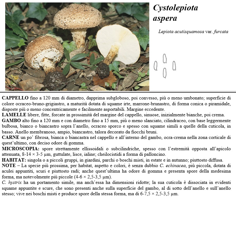 CAPPELLO fino a 120 mm di diametro, dapprima subgloboso, poi convesso, più o meno umbonato; superficie di colore ocraceo-bruno-grigiastro, a maturità dotata di squame irte; marrone-brunastro; di forma conica o piramidale; disposte più o meno concentricamente e facilmente asportabili. Margine eccedente. LAMELLE libere, fitte, forcate in prossimità del margine del cappello; sinuose, inizialmente bianche; poi crema. GAMBO alto fino a 120 mm e con diametro fino a 15 mm; più o meno slanciato, cilindraceo, con base leggermente bulbosa, bianco o biancastro sopra l'anello, ocraceo sporco e spesso con squame simili a quelle della cuticola; in basso. Anello membranoso, ampio, biancastro; talora decorato da fiocchi bruni. CARNE un po' fibrosa, bianca o biancastra nel cappello e all'interno del gambo, ocra-crema nella zona corticale di quest'ultimo, con deciso odore di gomma. MICROSCOPIA spore strettamente ellissoidali o subcilindriche, spesso con l'estremità opposta all'apicolo attenuata, 8-14 x 3-5 µm, guttulate, lisce, ialine, cheilocistidi a forma di palloncino. HABITAT singola o a piccoli gruppi, in giardini; parchi o boschi misti, in estate e in autunno; piuttosto diffusa. NOTE - La specie più prossima, per habitat, aspetto e colori, è senza dubbio C. echinacea; più piccola, dotata di aculei appuntiti, scuri e piuttosto radi; anche quest'ultima ha odore di gomma e presenta spore della medesima forma; ma notevolmente più piccole (4-6 x 2,5-3,5 µm). C. hystrix ha un portamento simile, ma anch'essa ha dimensioni ridotte; la sua cuticola è dissociata in evidenti squame appuntite e scure; che sono presenti anche sulla superficie del gambo; al di sotto dell'anello e sull'anello stesso; vive nei boschi misti e produce spore della stessa forma, ma di 6-7,5 x 2,5-3,5 µm.