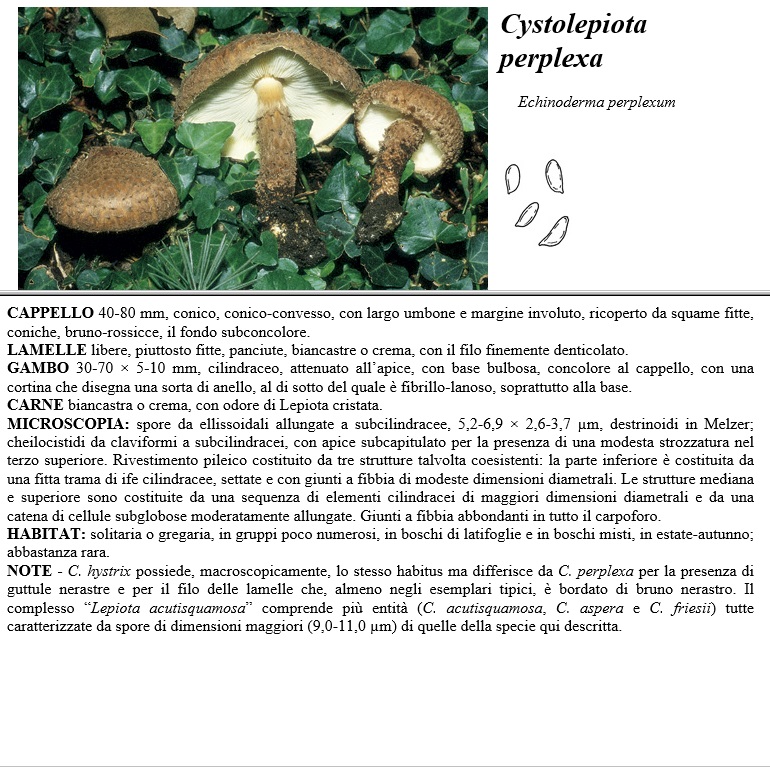 CAPPELLO 40-80 mm, conico, conico-convesso, con largo umbone e margine involuto, ricoperto da squame fitte, coniche, bruno-rossicce. il fondo subconcolore. LAMELLE libere, piuttosto fitte, panciute, biancastre o crema, con il filo finemente denticolato. GAMBO 30-70 x 5-10 mm, cilindraceo, attenuato all'apice, con base bulbosa concolore al cappello; con una cortina che disegna una sorta di anello, al di sotto del quale è fibrillo-lanoso, soprattutto alla base. CARNE biancastra o crema, con odore di Lepiota cristata. MICROSCOPIA spore da ellissoidali allungate a subcilindracee, 5,2-6,9 x 2.6-3.7 µm; destrinoidi in Melzer; cheilocistidi da claviformi a subcilindracei, con apice subcapitulato per la presenza di una modesta strozzatura nel terzo superiore. Rivestimento pileico costituito da tre strutture talvolta coesistenti: la parte inferiore è costituita da una fitta trama di ife cilindracee, settate e con giunti a fibbia di modeste dimensioni diametrali. Le strutture mediana e superiore sono costituite da una sequenza di elementi cilindracei di maggiori dimensioni diametrali e da una catena di cellule subglobose moderatamente allungate. Giunti a fibbia abbondanti in tutto il carpoforo. HABITAT solitaria o gregaria, in gruppi poco numerosi, in boschi di latifoglie e in boschi misti, in estate-autunno; abbastanza rara. NOTE - C. hystrix possiede; macroscopicamente, lo stesso habitus ma differisce da C. perplexa per la presenza di guttule nerastre e per il filo delle lamelle che; almeno negli esemplari tipici, è bordato di bruno nerastro. Il complesso "Lepiota acutisquamosa" comprende più entità (C. acutisquamosa, C aspera e C. friesii) tutte caratterizzate da spore di dimensioni maggiori (9,0-11,0 µm) di quelle della specie qui descritta.