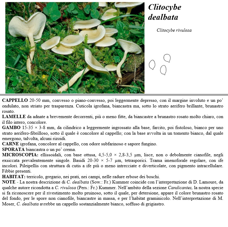 CAPPELLO 20-50 mm, convesso o piano-convesso, poi leggermente depresso, con il margine involuto e un po' ondulato, non striato per trasparenza. Cuticola igrofana, biancastra ma, sotto lo strato aerifero brillante, brunastro rosato. LAMELLE da adnate a brevemente decorrenti, più o meno fitte, da biancastre a brunastro rosato molto chiaro, con il filo intero, concolore. GAMBO 15-35 x 3-8 mm, da cilindrico a leggermente ingrossato alla base, farcito, poi fistoloso, bianco per uno strato aerifero-fibrilloso, sotto il quale è concolore al cappello, con la base avvolta in un tomento bianco, dal quale emergono, talvolta, alcuni rizoidi. CARNE igrofana, concolore al cappello, con odore subfarinoso e sapore fungino. SPORATA biancastra o un po' crema. MICROSCOPIA ellissoidali, con base ottusa, 4,5-5,0 x 2,8-3,5 µm, lisce, non o debolmente cianofile, negli exsiccata prevalentemente singole. Basidi 20-30 x 5-7 µm, tetrasponci. Trama imenoforale regolare, con ife incolori. Pileipellis con struttura di cutis a ife più o meno intrecciate e diverticolate, con pigmento intracellulare. Fibbie presenti. HABITAT terricolo, gregario, nei prati, nei campi, nelle radure erbose dei boschi. NOTE - La nostra descrizione di C. dealbata (Sow.: Fr.) Kummer coincide con l'interpretazione di D. Lamoure, da qualche autore ricondotta a C. rivulosa (Pers.: Fr.) Kummer. Nell'ambito della sezione Candicantes, la nostra specie si fa riconoscere per il rivestimento molto pruinoso, sotto il quale, per detersione, appare il colore brunastro rosato del fondo, per le spore non cianofile, biancastre in massa, e per l'habitat graminicolo. Nell'interpretazione di M. Vloser; C. dealbata avrebbe un cappello sostanzialmente bianco, soffuso di grigiastro.