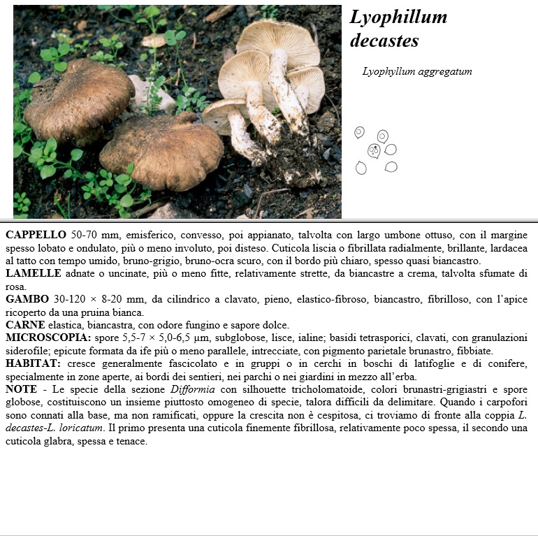 CAPPELLO 50-70 mm, emisferico, convesso, poi appianato, talvolta con largo umbone ottuso, con il margine spesso lobato e ondulato, più o meno involuto, poi disteso. Cuticola liscia o fibrillata radialmente, brillante, lardacea al tatto con tempo umido, bruno-grigio, bruno-ocra scuro, con il bordo più chiaro, spesso quasi biancastro. LAMELLE adnate o uncinate, più o meno fitte, relativamente strette, da biancastre a crema, talvolta sfumate di rosa. GAMBO 30-120 x 8-20 mm, da cilindrico a clavato, pieno, elastico-fibroso, biancastro, fibrilloso. con l'apice ricoperto da una pruina bianca. CARNE elastica, biancastra, con odore fungino e sapore dolce. MICROSCOPIA spore 5,5-7 x 5,0-6,5 um, subglobose, lisce, ialine, basidi tetrasporici, clavati, con granulazioni siderofile, epicute formata da ife più o meno parallele, intrecciate, con pigmento parietale brunastro, fibbiate. HABITAT cresce generalmente fascicolato e in gruppi o in cerchi in boschi di latifoglie e di conifere, specialmente in zone aperte, ai bordi dei sentieri, nei parchi o nei giardini in mezzo all' erba. NOTE - Le specie della sezione Difformia con silhouette tricholomatoide, colori brunastri-grigiastri e spore globose, costituiscono un insieme piuttosto omogeneo di specie, talora difficili da delimitare. Quando i carpofori sono connati alla base, ma non ramificati, oppure la crescita non è cespitosa, ci troviamo di fronte alla coppia L. decastes-L. loricatum. Il primo presenta una cuticola finemente fibrillosa, relativamente poco spessa, il secondo una cuticola glabra, spessa e tenace.