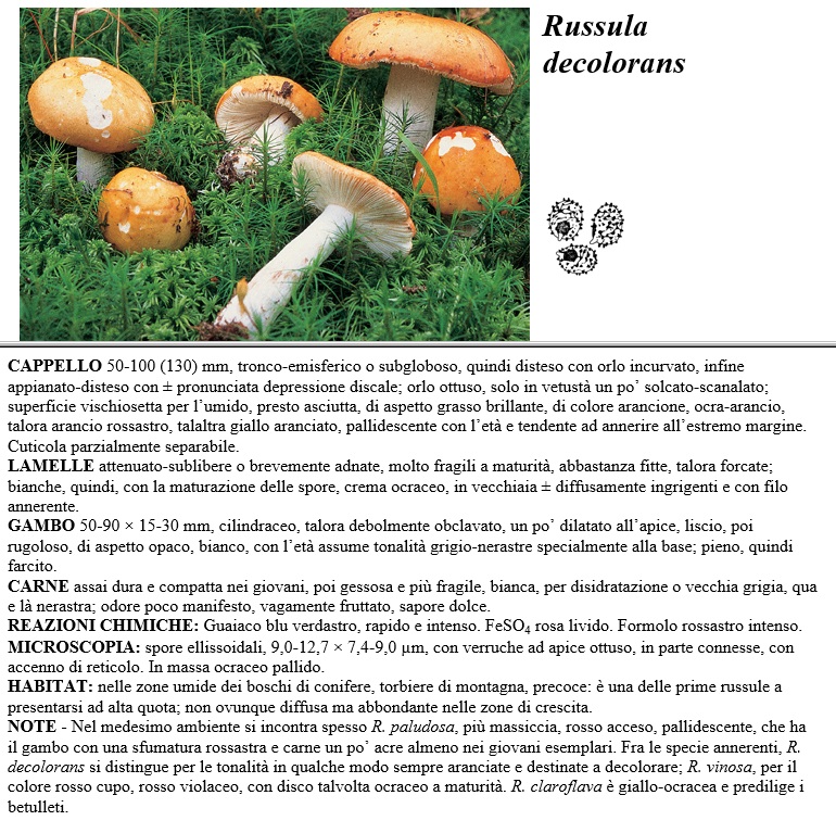 CAPPELLO 50-100 (130) mm, tronco-emisferico o subgloboso, quindi disteso con orlo incurvato, infine appianato-disteso conpiù o meno pronunciata depressione discale; orlo ottuso, solo in vetustà un po' solcato-scanalato; superficie vischiosetta per l'umido, presto asciutta, di aspetto grasso brillante, di colore arancione, ocra-arancio; talora arancio rossastro, talaltra giallo aranciato, pallidescente con 1'età e tendente ad annerire all'estremo margine. Cuticola parzialmente separabile. LAMELLE attenuato-sublibere o brevemente adnate, molto fragili a maturità, abbastanza fitte, talora forcate; bianche, quindi, con la maturazione delle spore, crema ocraceo, in vecchiaia più o meno diffusamente ingrigenti e con filo annerente. GAMBO 50-90 x 15-30 mm, cilindraceo, talora debolmente obclavato, un po' dilatato all'apice, liscio, poi rugoloso, di aspetto opaco, bianco; con l'età assume tonalità grigio-nerastre specialmente alla base; pieno, quindi farcito. CARNE assai dura e compatta nei giovani, poi gessosa e più fragile, bianca, per disidratazione o vecchia grigia qua e là nerastra; odore poco manifesto, vagamente fruttato, sapore dolce. REAZIONI CHIMICHE Guaiaco blu verdastro, rapido e intenso. FeSO; rosa livido. Formolo rossastro intenso. MICROSCOPIA spore ellissoidali, 9,0-12,7 x 7,4-9,0 µm, con verruche ad apice ottuso, in parte connesse, con accenno di reticolo. In massa ocraceo pallido. HABITAT nelle zone umide dei boschi di conifere, torbiere di montagna, precoce: è una delle prime russule a presentarsi ad alta quota; non ovunque diffusa ma abbondante nelle zone di crescita. NOTE - Nel medesimo ambiente si incontra spesso R. paludosa, più massiccia, rosso acceso, pallidescente, che ha il gambo con una sfumatura rossastra e carne un po' acre almeno nei giovani esemplari. Fra le specie annerenti, R. decolorans si distingue per le tonalità in qualche modo sempre aranciate e destinate a decolorare; R. vinosa; per il colore rosso cupo, rosso violaceo, con disco talvolta ocraceo a maturità. R. claroflava a è giallo-ocracea e predilige i betulleti.