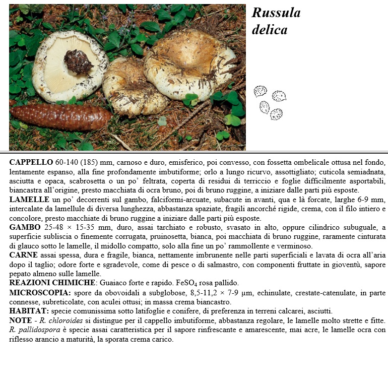 CAPPELLO 60-140 (185) mm, carnoso e duro; emisferico; poi concesso, con fossetta ombelicale ottusa nel fondo, lentamente espanso, alla fine profondamente imbutiforme; orlo a lungo ricurvo, assottigliato: cuticola semiadnata, asciutta e opaca, scabrosetta o un po' feltrata, coperta di residui di terriccio e foglie difficilmente asportabili, biancastra all'origine, presto macchiata di ocra bnzno, poi di bruno ruggine, a iniziare dalle parti più esposte. LAMELLE un po' decorrenti sul gambo; falciformi-arcuate, subacute in avanti, qua e là forcate, larghe 6-9 mm, intercalate da lamellule di diversa lunghezza, abbastanza spaziate, fragili ancorché rigide, crema; con il filo intiero e concolore, presto macchiate di bruno ruggine a iniziare dalle parti più esposte. GAMBO 25-48 x 15-35 mm, duro; assai tarchiato e robusto; svasato in alto, oppure cilindrico subuguale; a superficie subliscia o finemente corrugata, pruinosetta, bianca, poi macchiata di bruno ruggine, raramente cinturata di glauco sotto le lamelle, il midollo compatto, solo alla fine un po' rammollente e verminoso. CARNE assai spessa, dura e fragile; bianca, nettamente imbrunente nelle parti superficiali e lavata di ocra all'aria dopo il taglio; odore forte e sgradecole; come di pesce o di salmastro, con componenti fruttate in gioventù, sapore pepato almeno sulle lamelle. REAZIONI CHIMICHE Guaiaco forte e rapido. FeSO4 rosa pallido. MICROSCOPIA spore da obovoidali a subglobose; 8,5-11,2 x 7-9 µm; echinulate, crestate-catenulate, in parte connesse, subreticolate, con aculei ottusi; in massa crema biancastro. HABITAT specie comunissima sotto latifoglie e conifere, di preferenza in terreni calcarei, asciutti. NOTE - R. chloroides si distingue per il cappello imbutiforme, abbastanza regolare, le lamelle molto strette e fitte. R. pallidospora è specie assai caratteristica per il sapore rinfrescante e amarescente, mai acre, le lamelle ocra con riflesso arancio a maturità; la sporata crema carico.