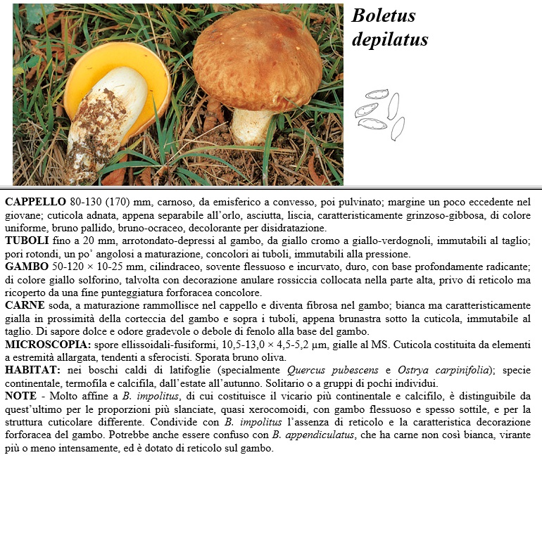 CAPPELLO 80-130 (170) mm, carnoso, da emisferico a concesso, poi pulvìnato, margine un poco eccedente nel giovane, cuticola adnata, appena separabile all'orlo, asciutta, liscia, caratteristicamente grinzoso-gibbosa, di colore uniforme, bruno pallido, bruno-ocraceo, decolorante per disidratazione. TUBOLI fino a 20 mm, arrotondato-depressi al gambo, da giallo cromo a giallo-verdognoli, immutabili al taglio, pori rotondi, un po' angolosi a maturazione, concolori ai tuboli, immutabili alla pressione. GAMBO 50-120 x 10-25 mm, cilindraceo, sovente flessuoso e incurvato, duro, con base profondamente radicante, di colore giallo solforino, talvolta con decorazione anulare rossiccia collocata nella parte alta, privo di reticolo ma ricoperto da una fine punteggiatura forforacea concolore. CARNE soda, a maturazione rammollisce nel cappello e diventa fibrosa nel gambo, bianca ma caratteristicamente gialla in prossimità della corteccia del gambo e sopra i tuboli, appena brunastra sotto la cuticola, immutabile al taglio. Di sapore dolce e odore gradevole o debole di fenolo alla base del gambo. MICROSCOPIA spore ellissoidali-fusiformi, 10,5-13,0 x 4,5-5,2 µm, gialle al MS. Cuticola costituita da elementi a estremità allargata, tendenti a sferocisti. Sporata bruno oliva. HABITAT nei boschi caldi di latifoglie (specialmente Quercus pubescens e Osma carpinifolia), specie continentale, termofila e calcifila dall'estate all'autunno. Solitario o a gruppi di pochi individui. NOTE - Molto affine a B. impolitus, di cui costituisce il vicario più continentale e calcifilo, è distinguibile da quest'ultimo per le proporzioni più slanciate, quasi xerocomoidi, con gambo flessuoso e spesso sottile, e per la struttura cuticolare differente. Condivide con B. impolitus l'assenza di reticolo e la caratteristica decorazione forforacea del gambo. Potrebbe anche essere confuso con B. appendiculatus, che ha carne non così bianca, virante più o meno intensamente, ed è dotato di reticolo sul gambo.
